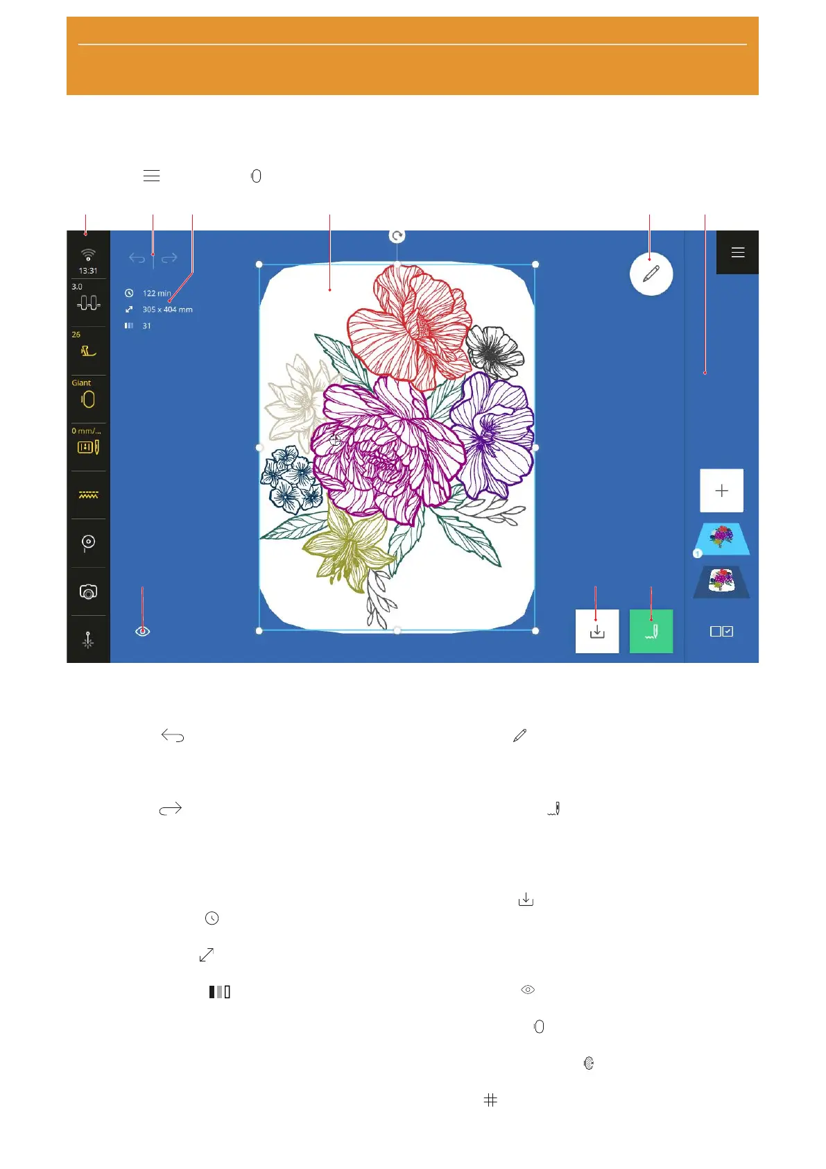 1Status Bar 2Undo/Redo 3Info Box 4Design Preview 5Edit 6Layer Bar 7Stitchout 8Save 9View