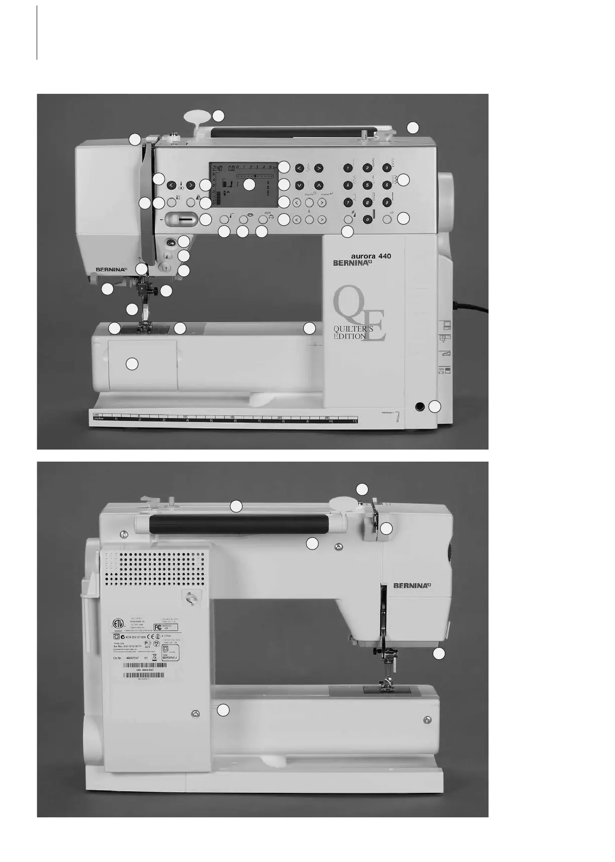 Bernina aurora 430 - Machine Parts Identification; Front View Identification; Rear View Identification