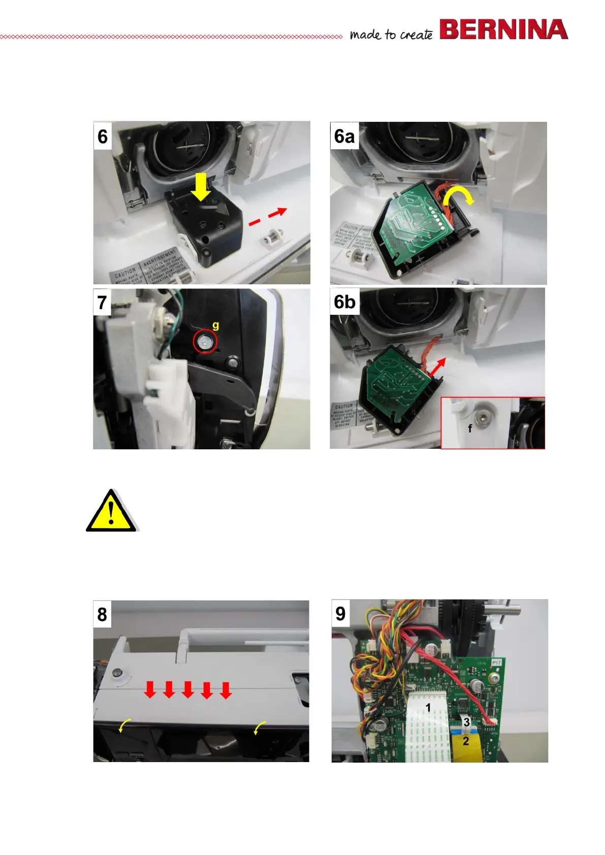 • Picture bottom right in picture 6b - Remove fastening screw (T10) f left of the bobbin door.