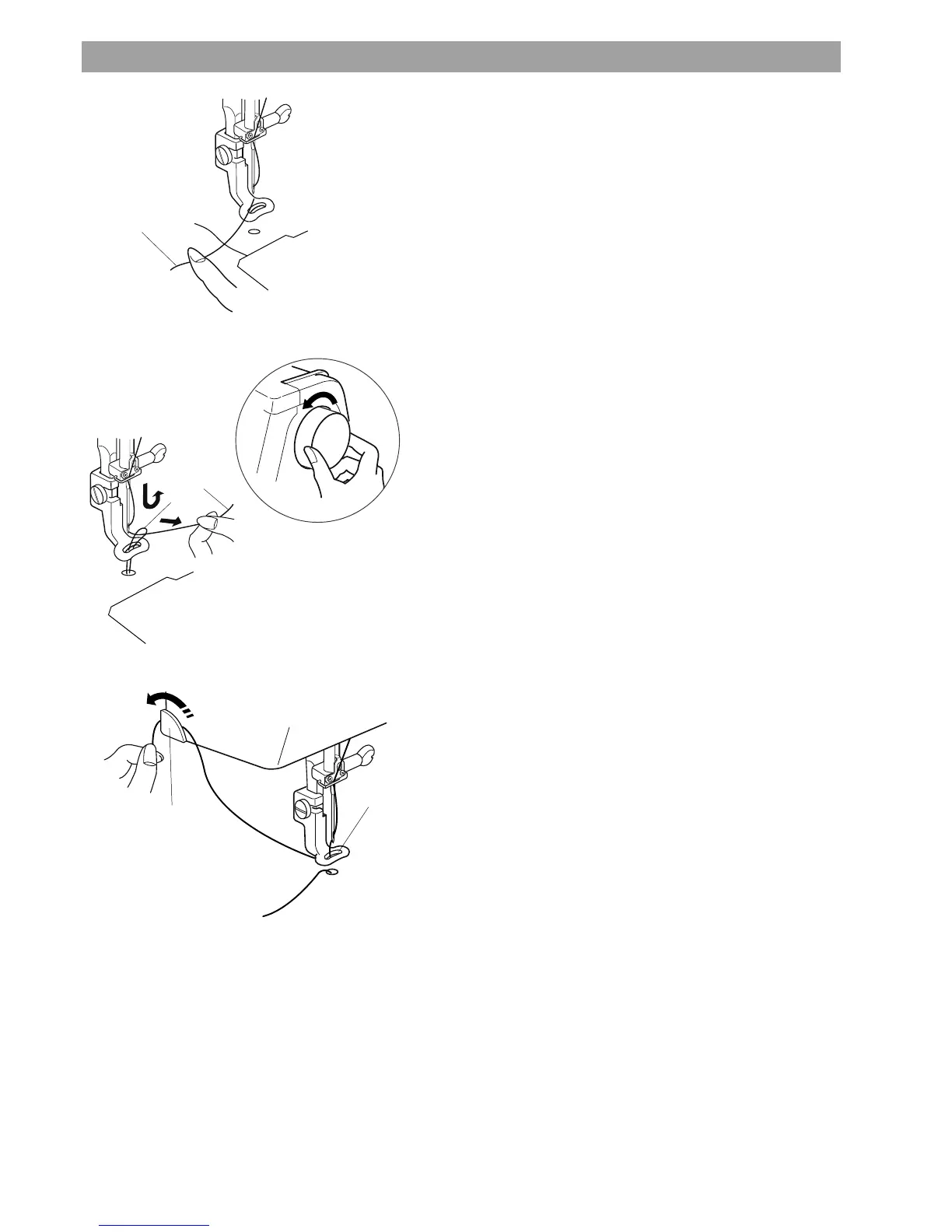 Raise the presser foot lifter. Hold the needle thread with your finger.