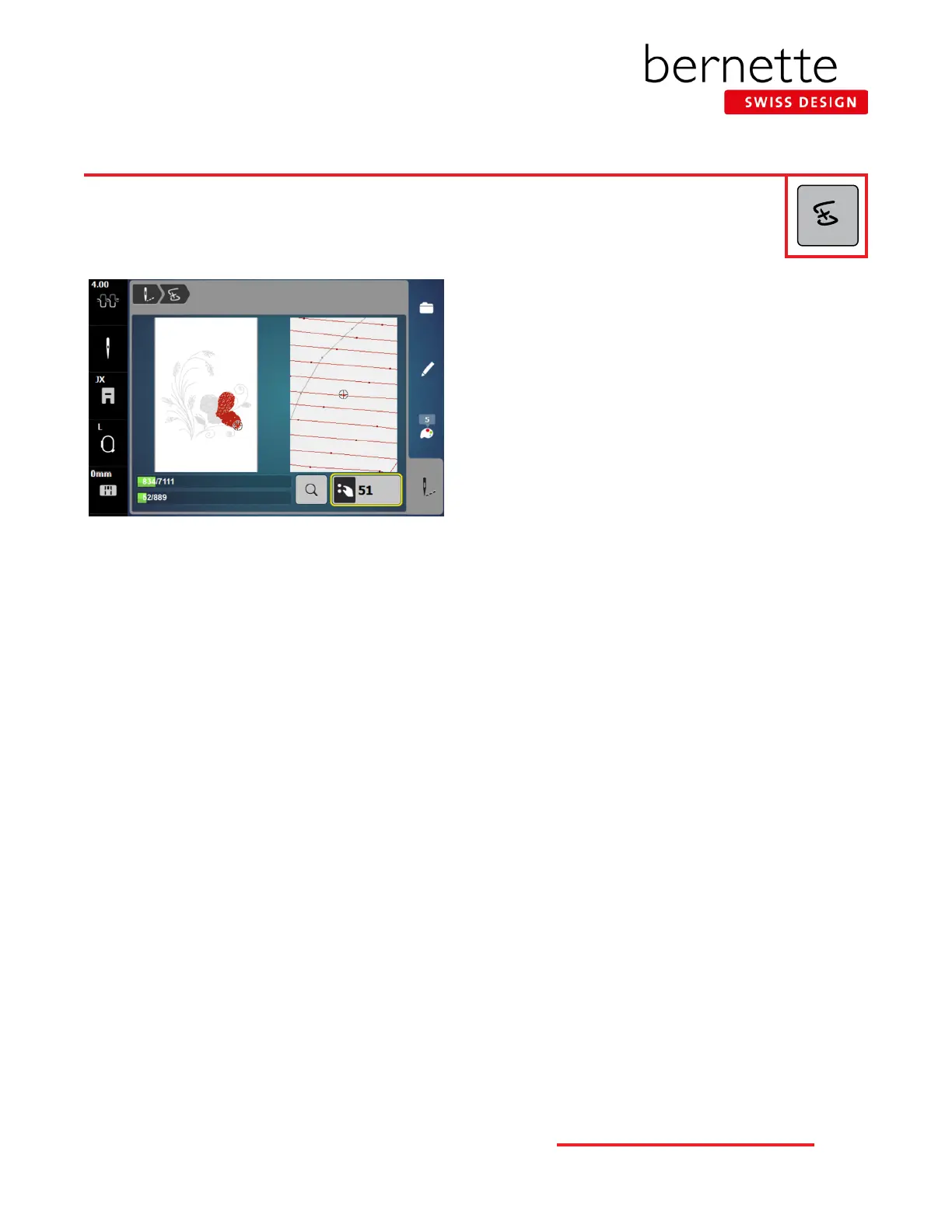 The number in the Information area shows the exact stitch number of the embroidery sequence. Touch the Selection of Stitch