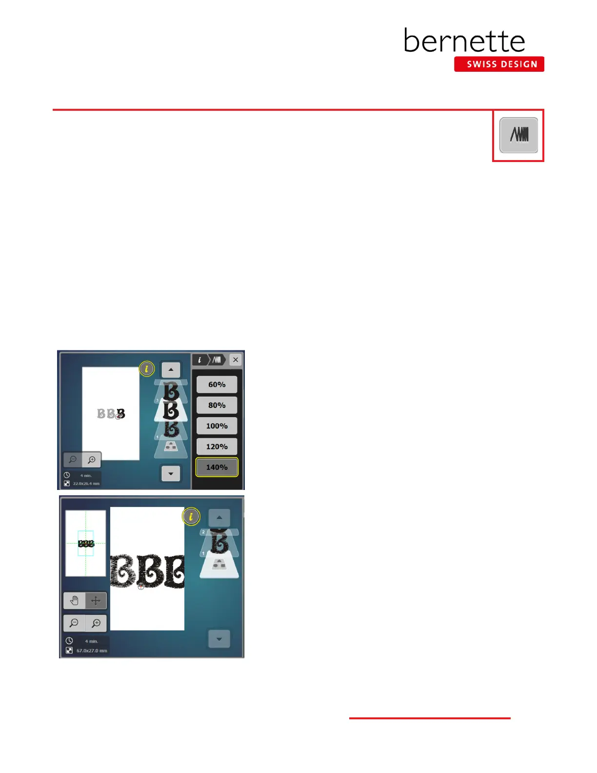 11. Touch the left B on the screen. Select “i”; select Embroidery Stitch