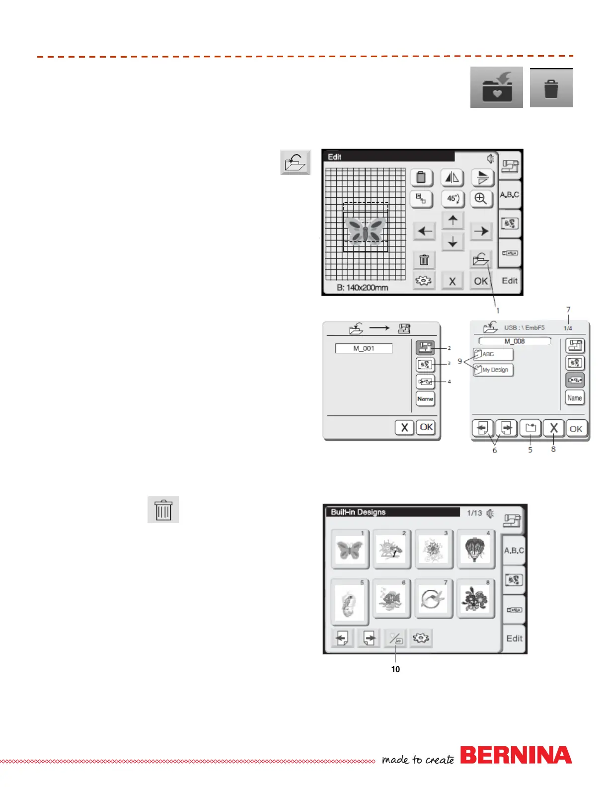 For designs saved in the machine, touch Built-in/