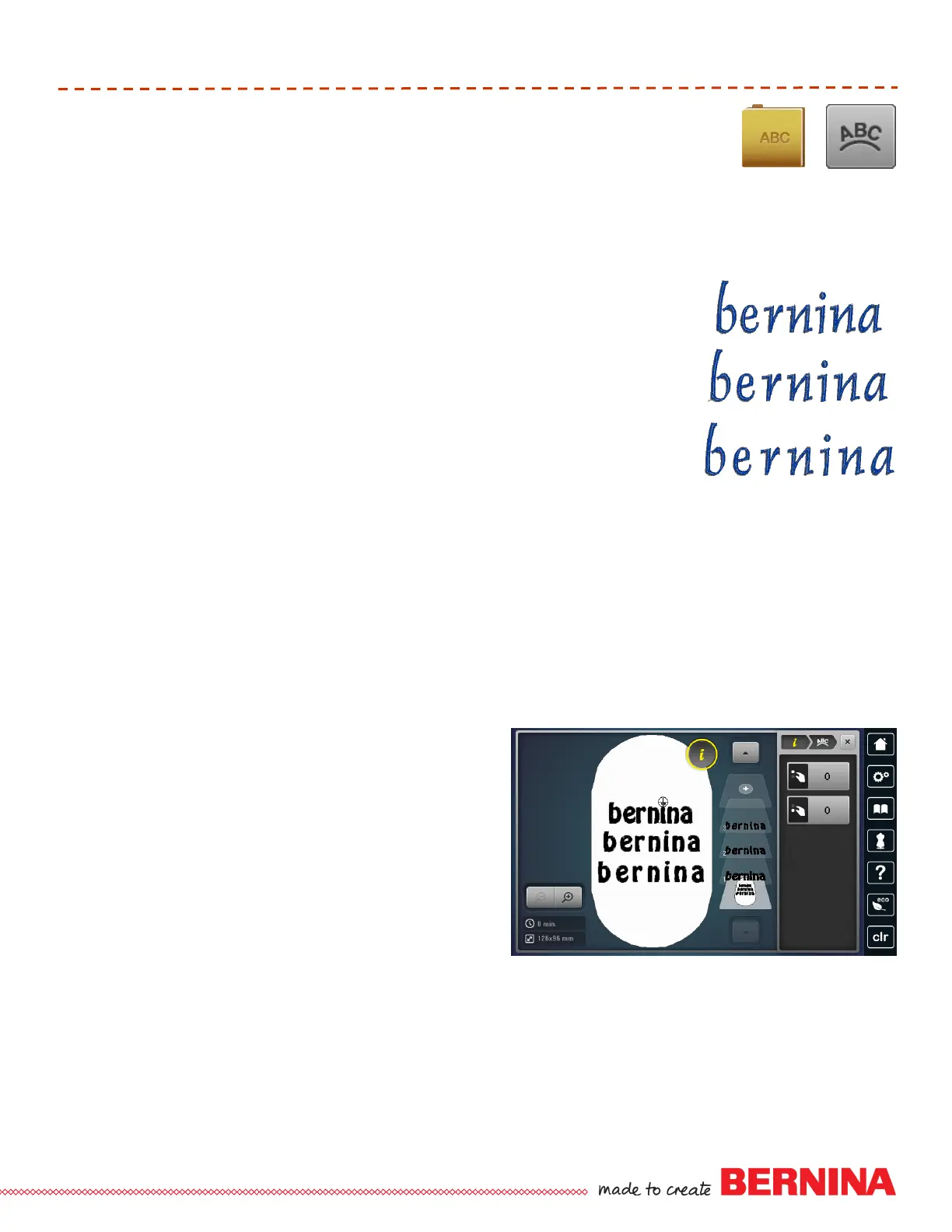 - 1st bernina Stitch Width knob = 0; Touch next word.