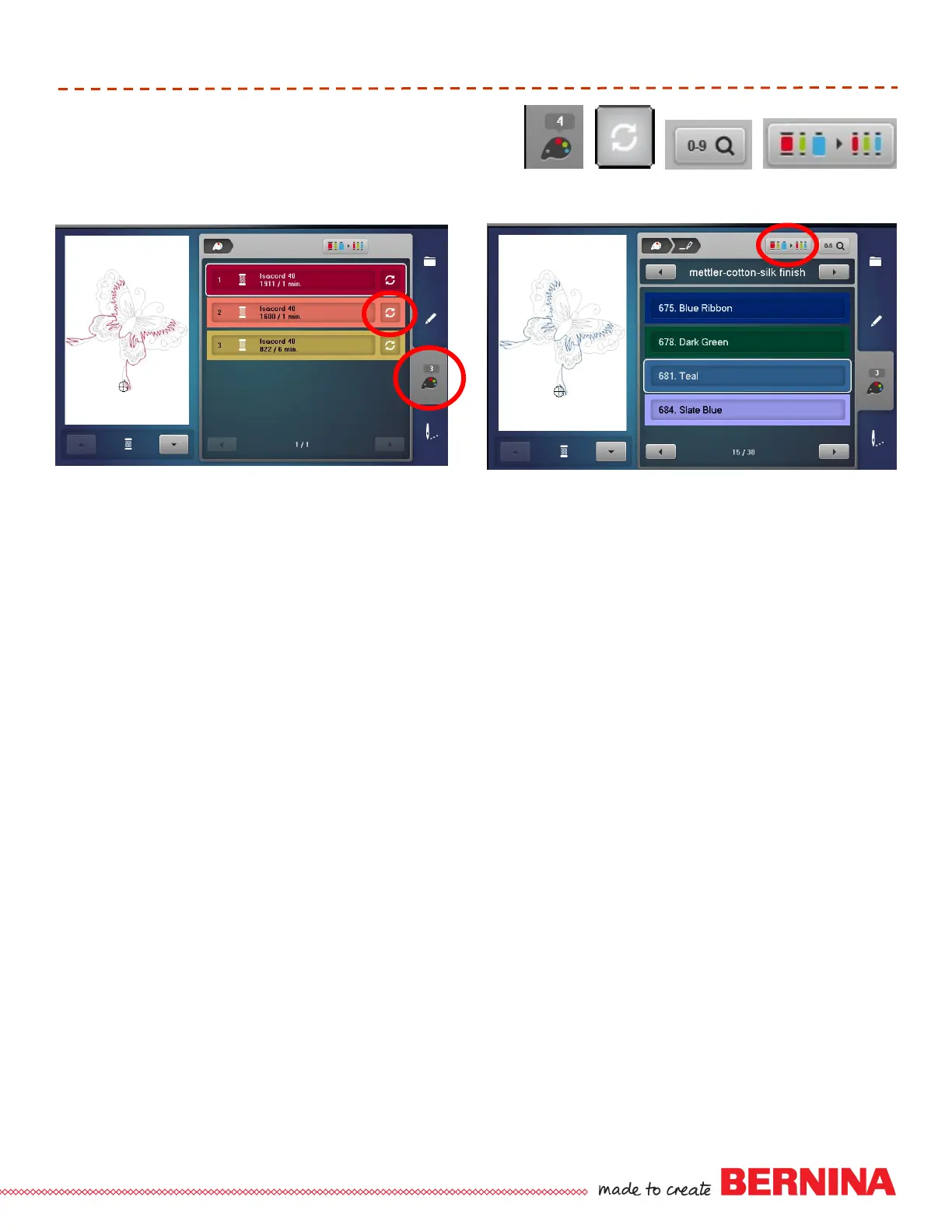 Individual thread colors and thread brands can be re-assigned on-screen.