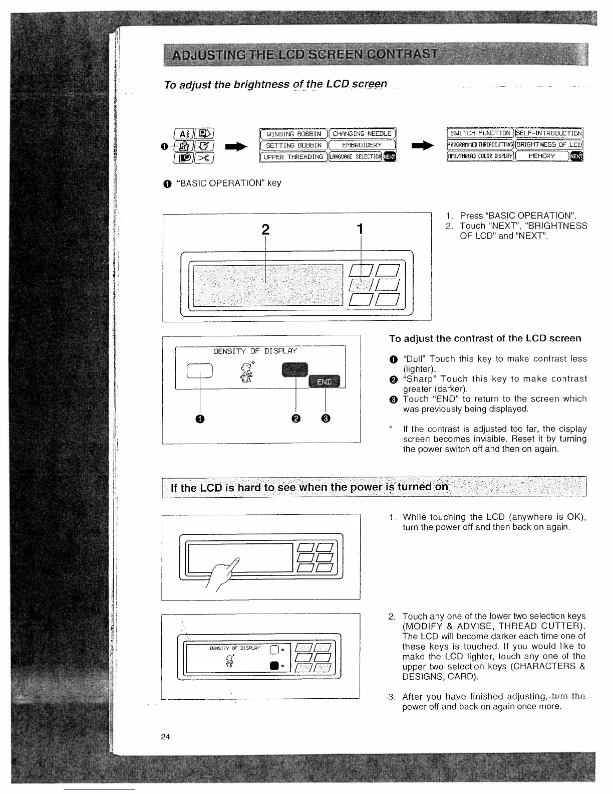 Bernina Deco 650 - Adjusting the LCD Screen Contrast; If the LCD Is Hard to See When the Power Is Turned on