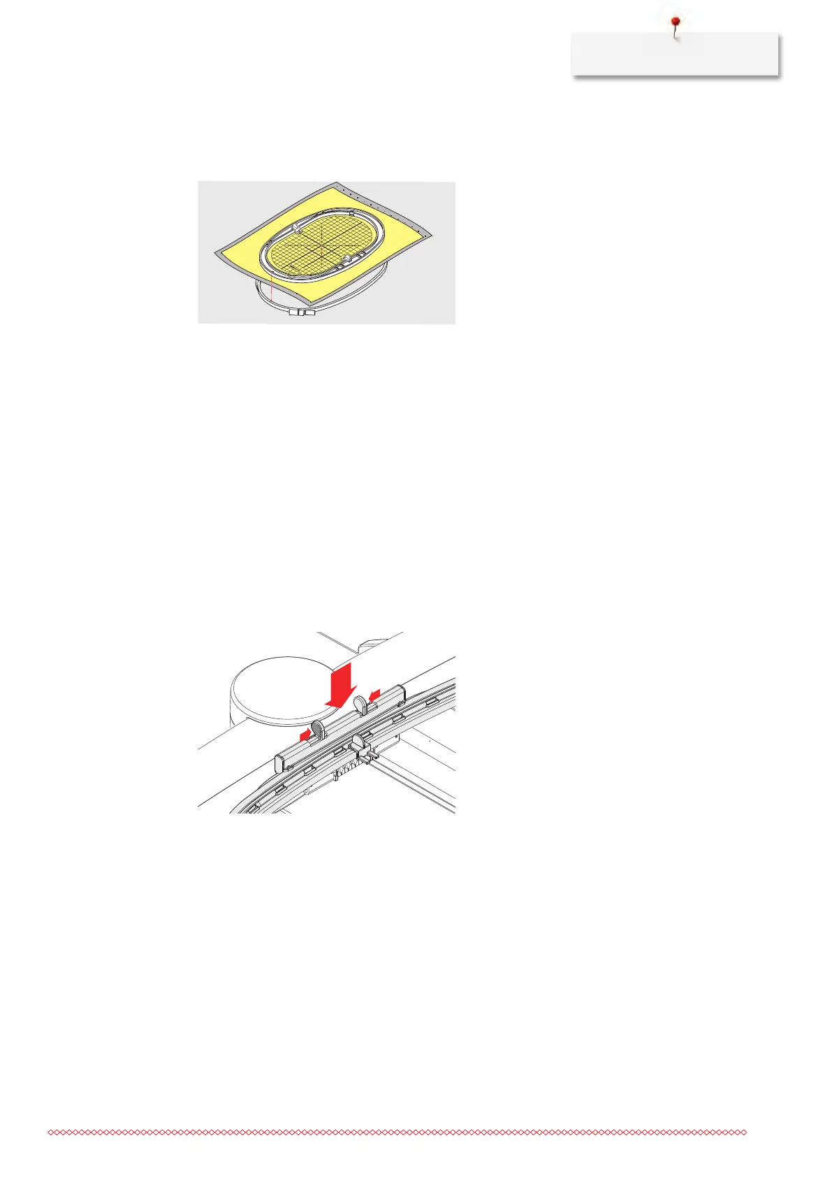 > Hold the hoop with the right side of the fabric up with the attaching mechanism to the left.