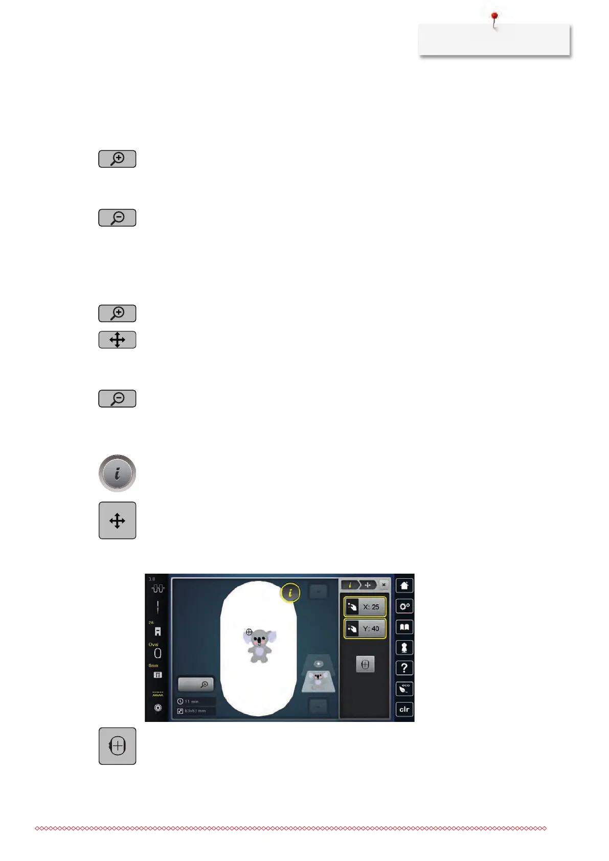 > To display the icon «Relocating a stitch pattern», tap «Zoom In».