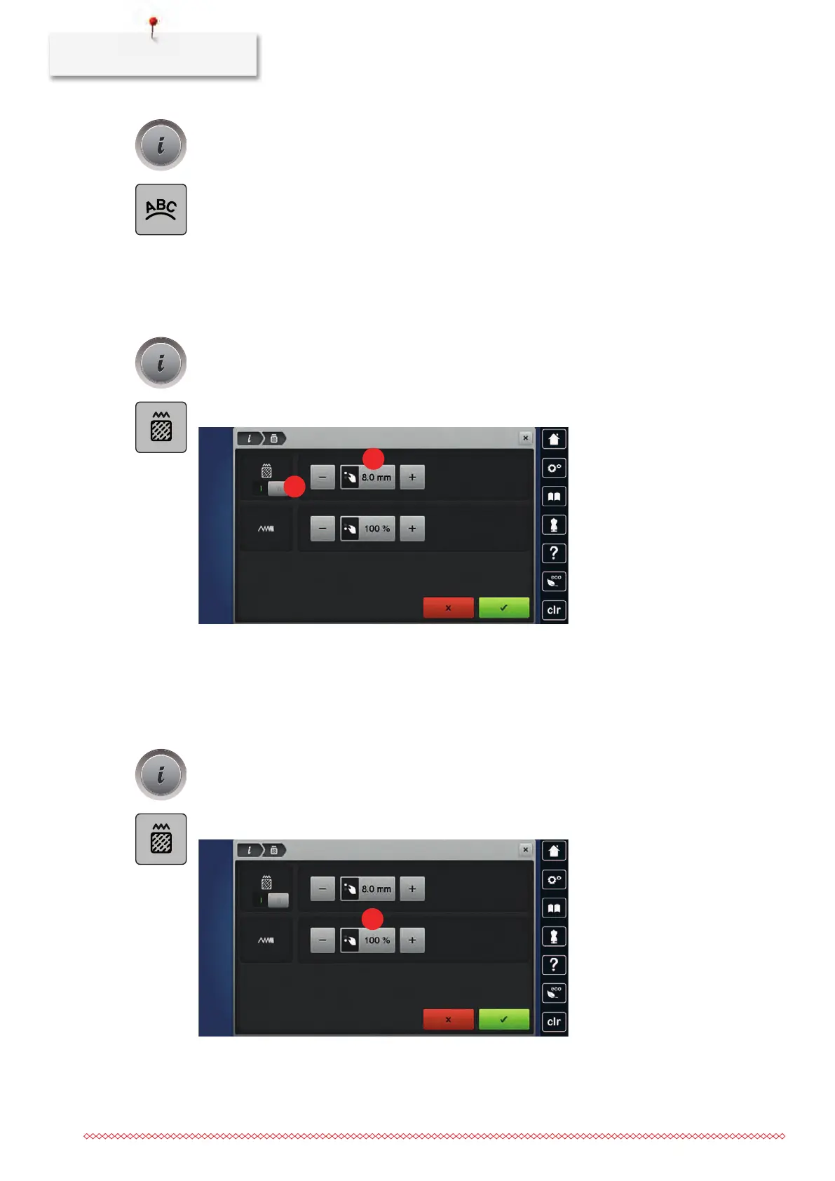 > Touch the switch in the upper section of the display (1) to change the satin stitch to the step stitch.