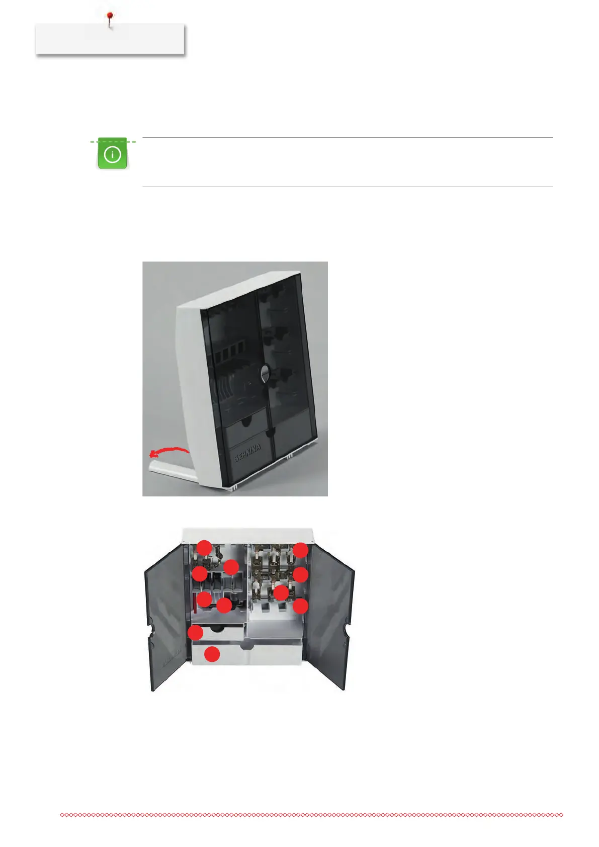 > Insert the holders(1) for bobbins, presser feet and needles into the accessory box.