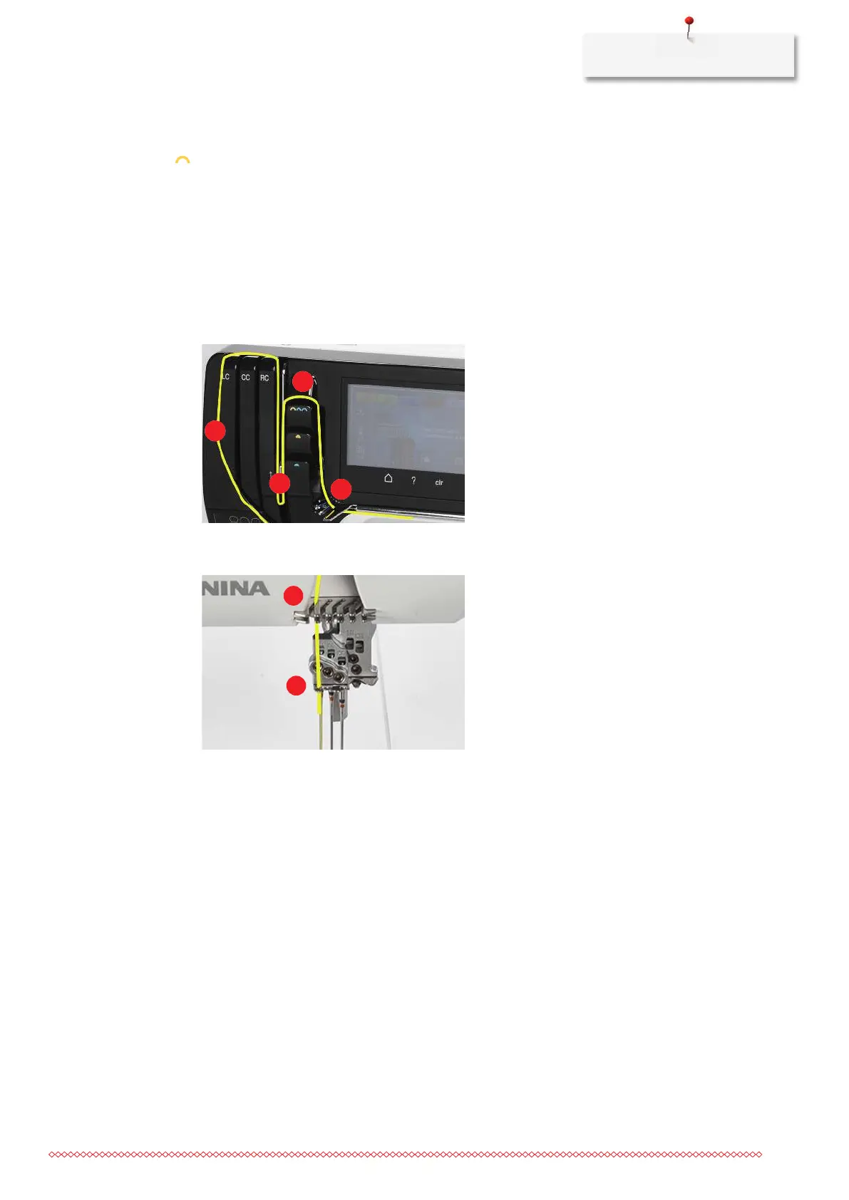 > Pull the thread beneath the thread guide plate to the left and through the yellow marking of the thread