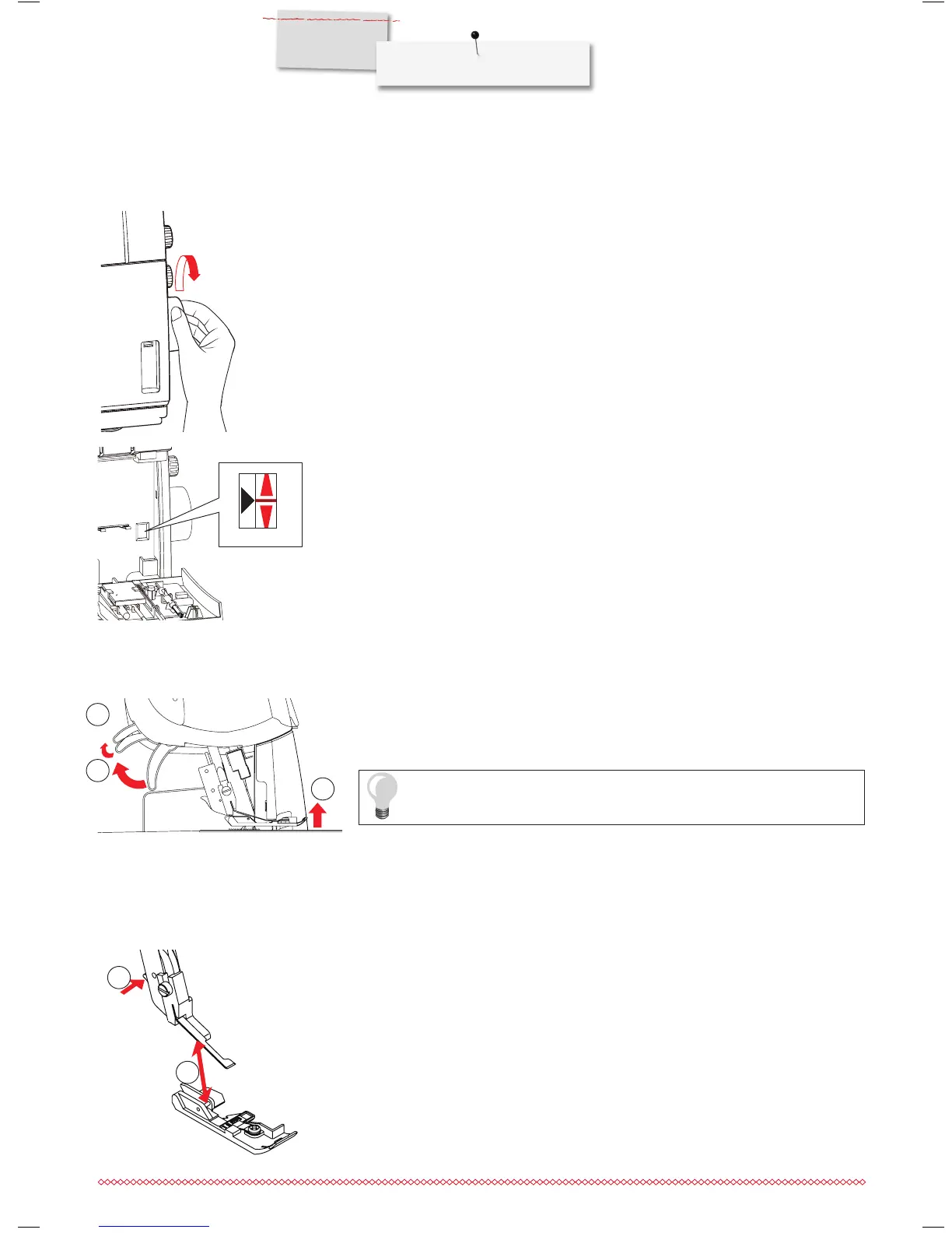 Press the presser foot lifter even further (2) for an extra raise of the presser foot and