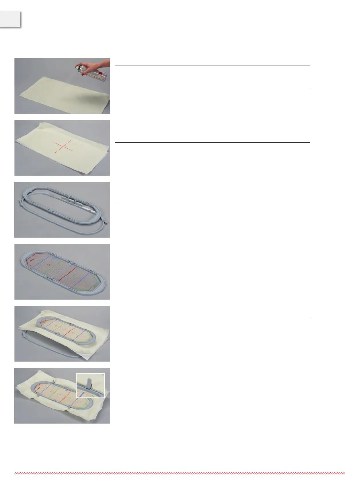 › Tensar firme y uniformemente el tejido y el velo para bordar en el bastidor.