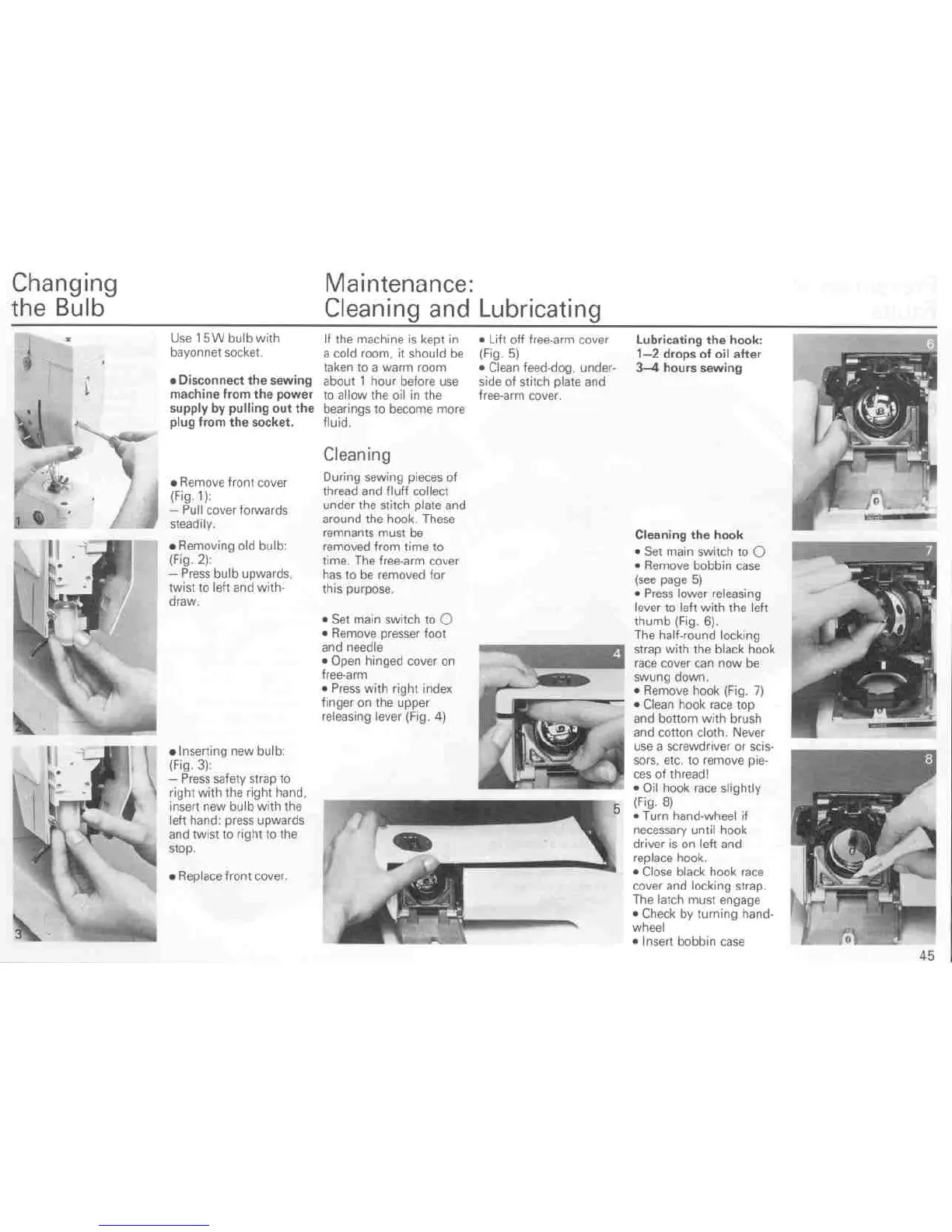 Bernina Record 930 Electronic - Machine Maintenance; Changing the Light Bulb; Routine Cleaning Procedures; Lubricating the Hook Assembly