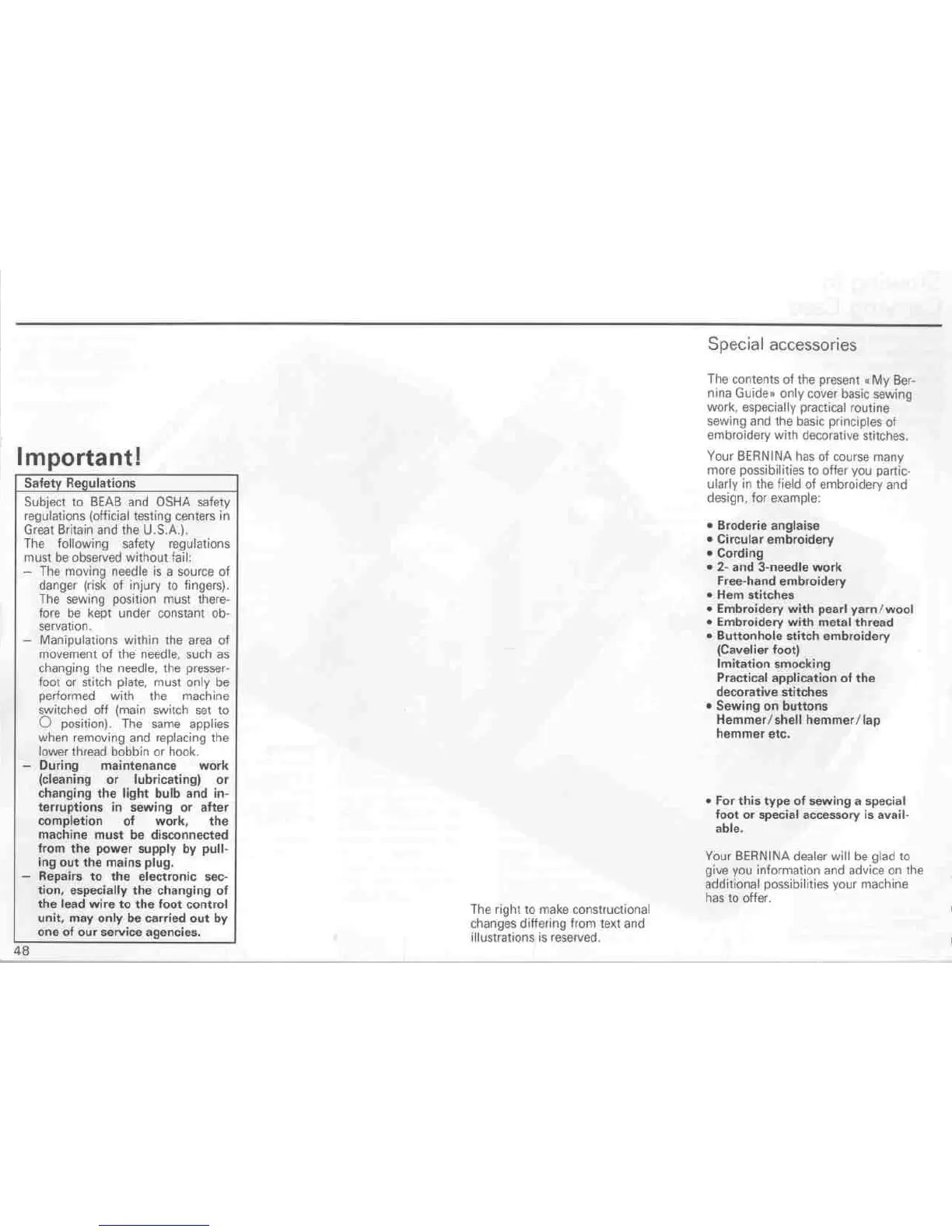 Bernina Record 930 Electronic - Important Information; Mandatory Safety Regulations; Overview of Special Accessories
