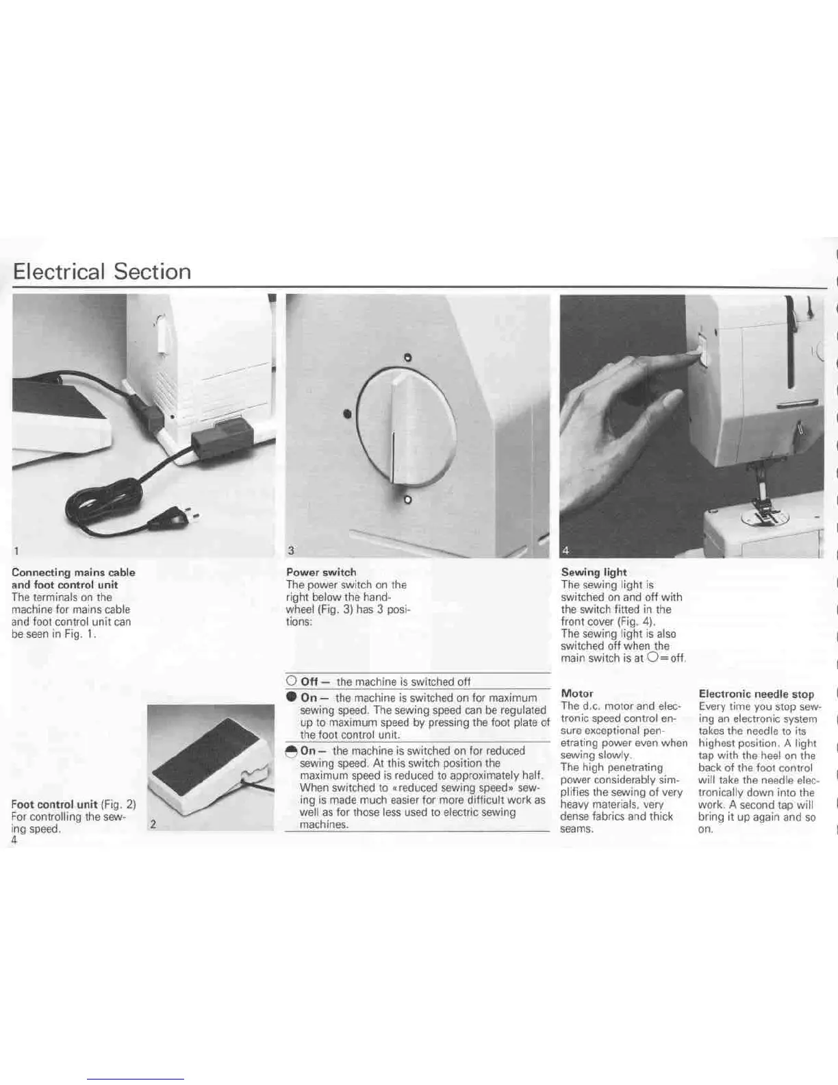 Bernina Record 930 Electronic - Electrical Section; Connecting Mains Cable and Foot Control Unit; Power Switch Operation; Motor and Speed Control