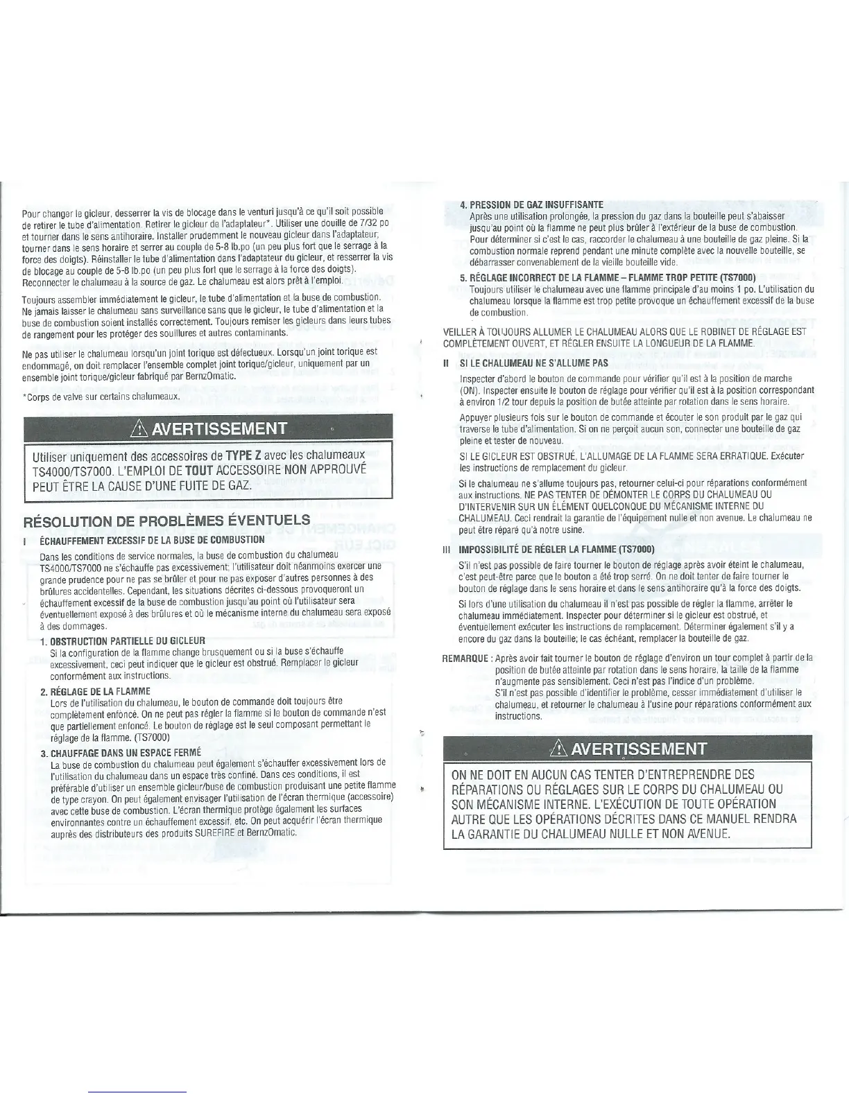 Bernzomatic TS2000K - Troubleshooting Potential Problems; Torch Not Lighting Troubleshooting; Flame Adjustment Troubleshooting (TS7000)