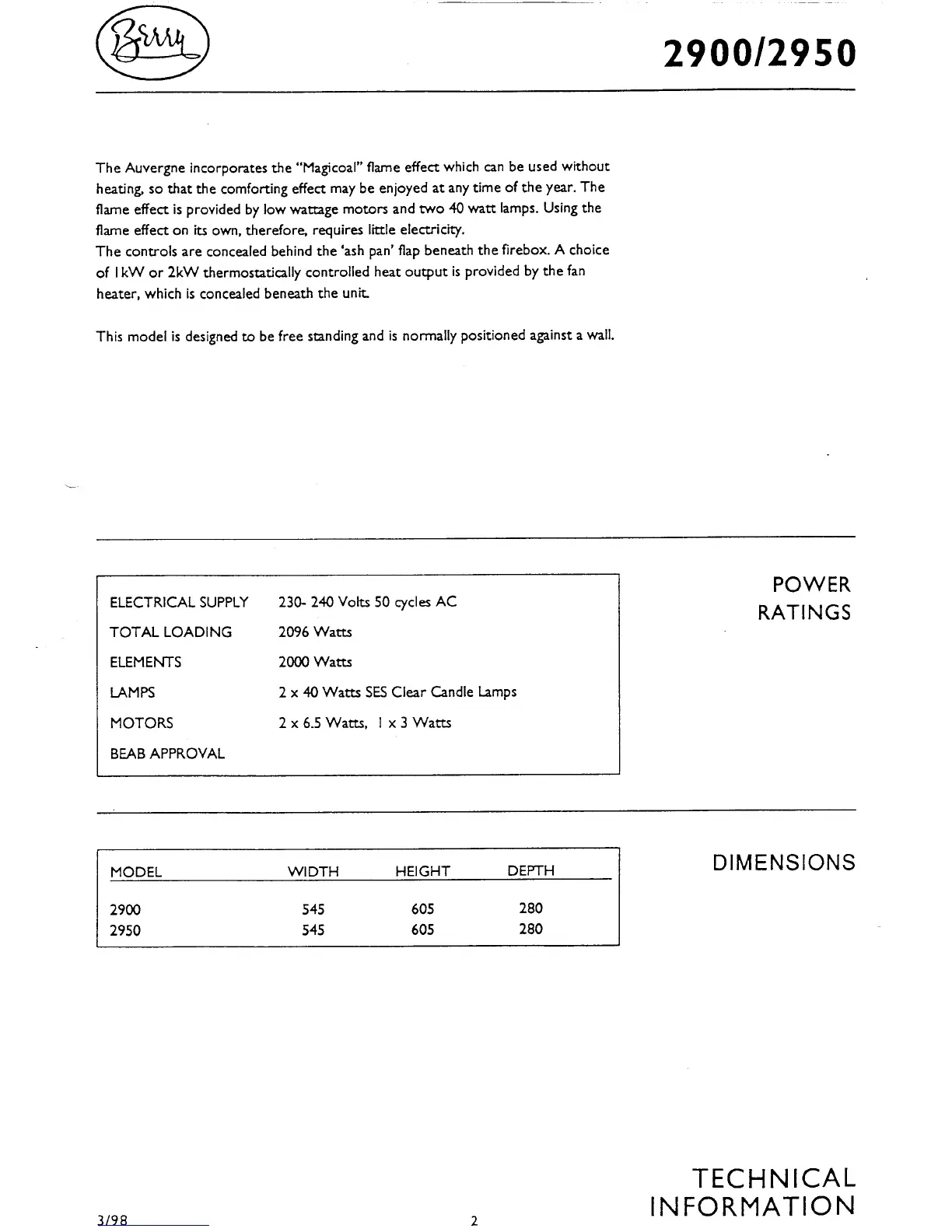 Berry 2900 - Technical Information - 2900;2950; Product Description and Features; Electrical Specifications and Dimensions