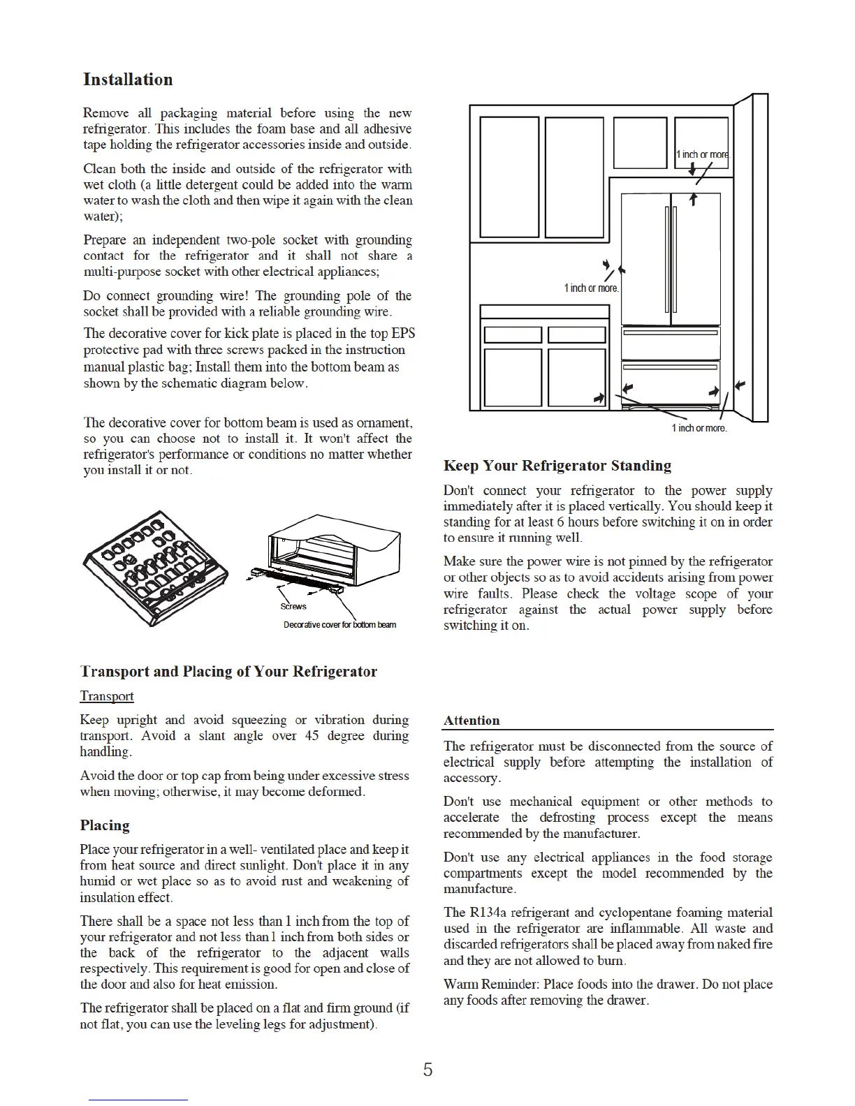 Bertazzoni REF36 X - Installation Guide; Proper Refrigerator Placement; Electrical Connection Requirements; Transport and Handling Precautions