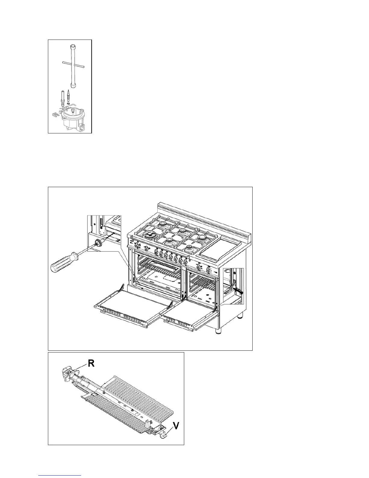 3) Loosen and the screw V and pull out the burner from the support being careful not to damage the ignition plug and
