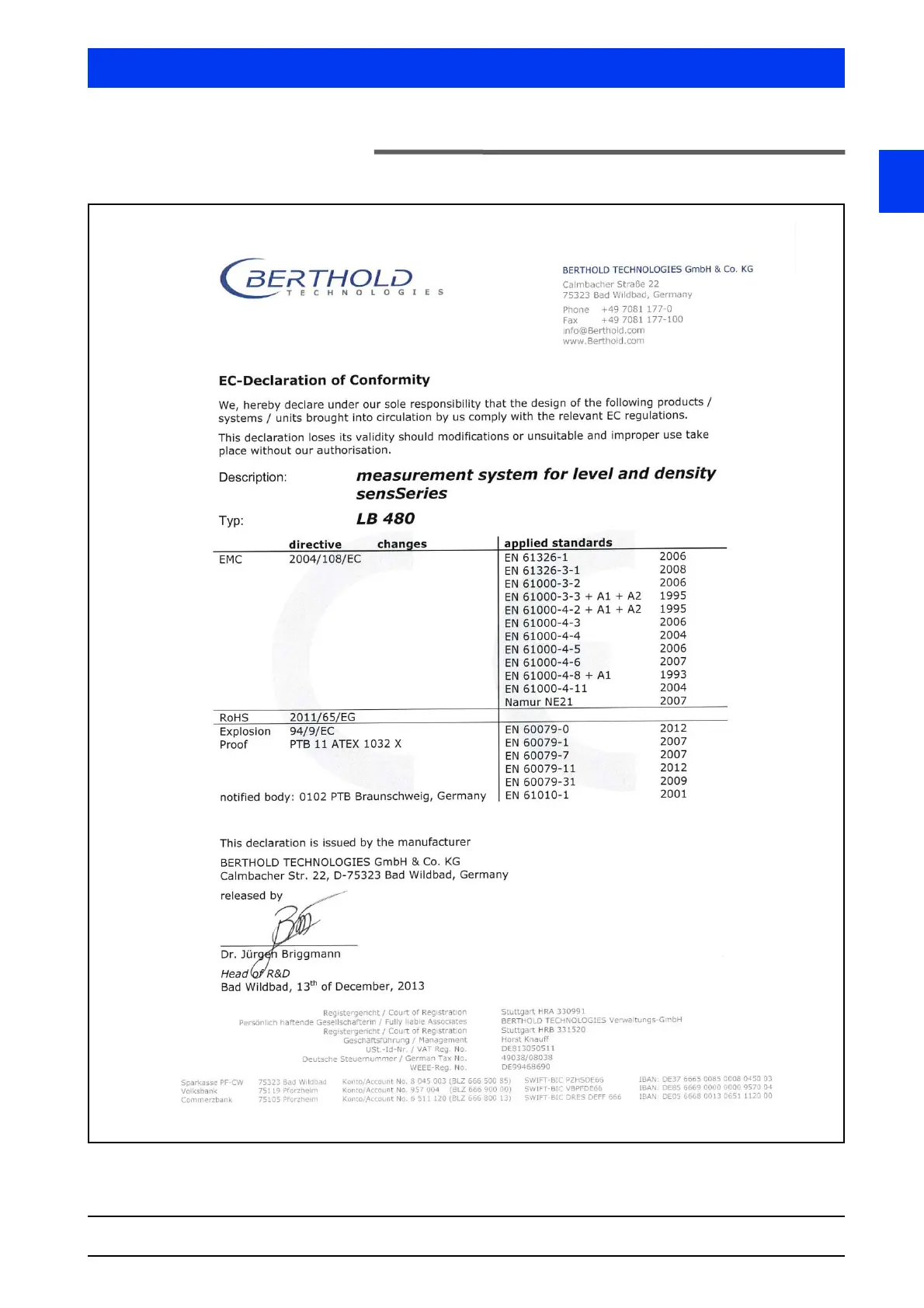 BERTHOLD TECHNOLOGIES LB 480 - Declaration of Conformity