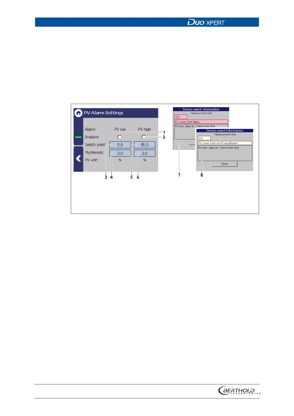Device settings | Setup | Alarms | PV alarm settings