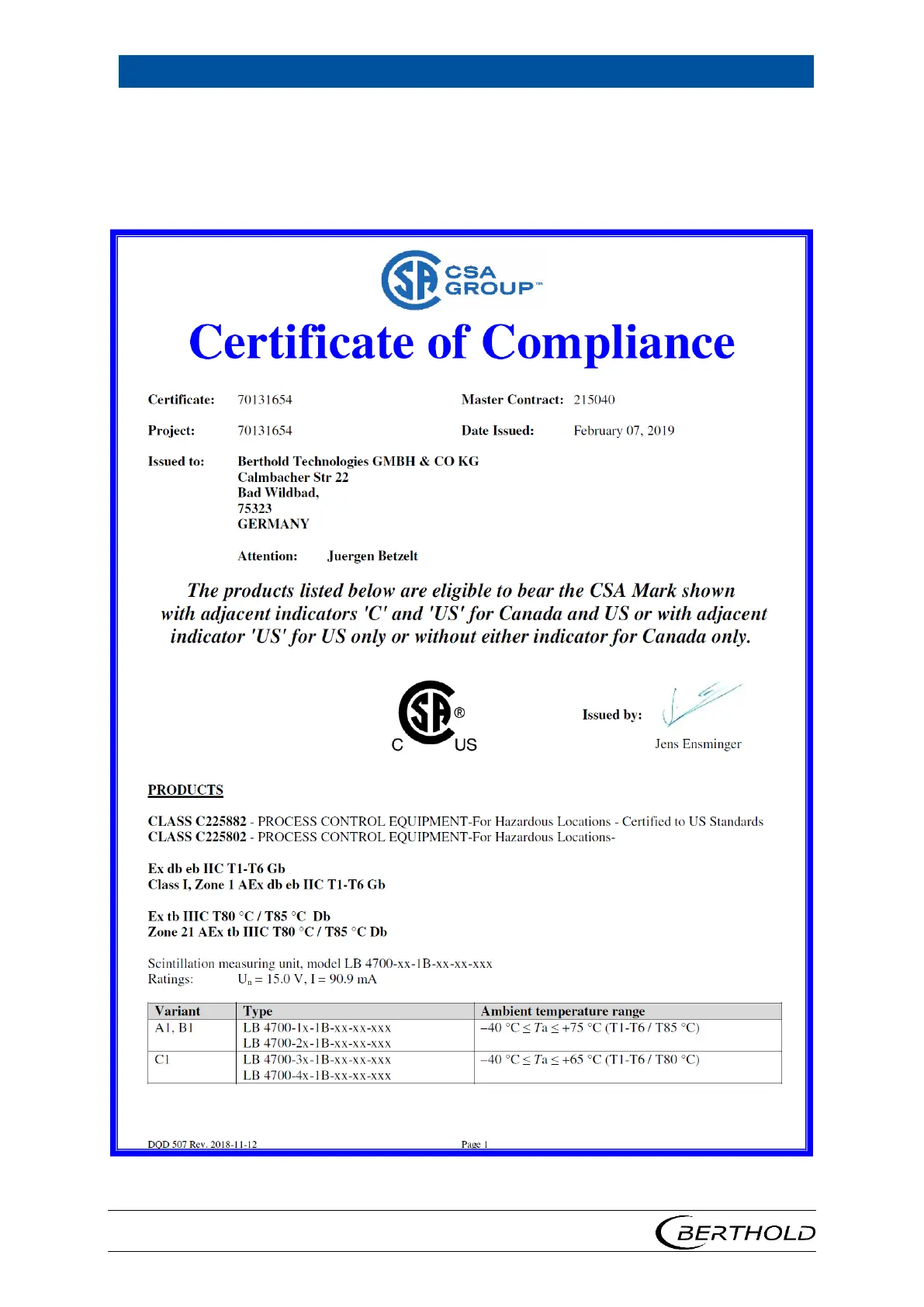 Berthold LB 4700 - 14 NEC;CEC Hazloc Certificate