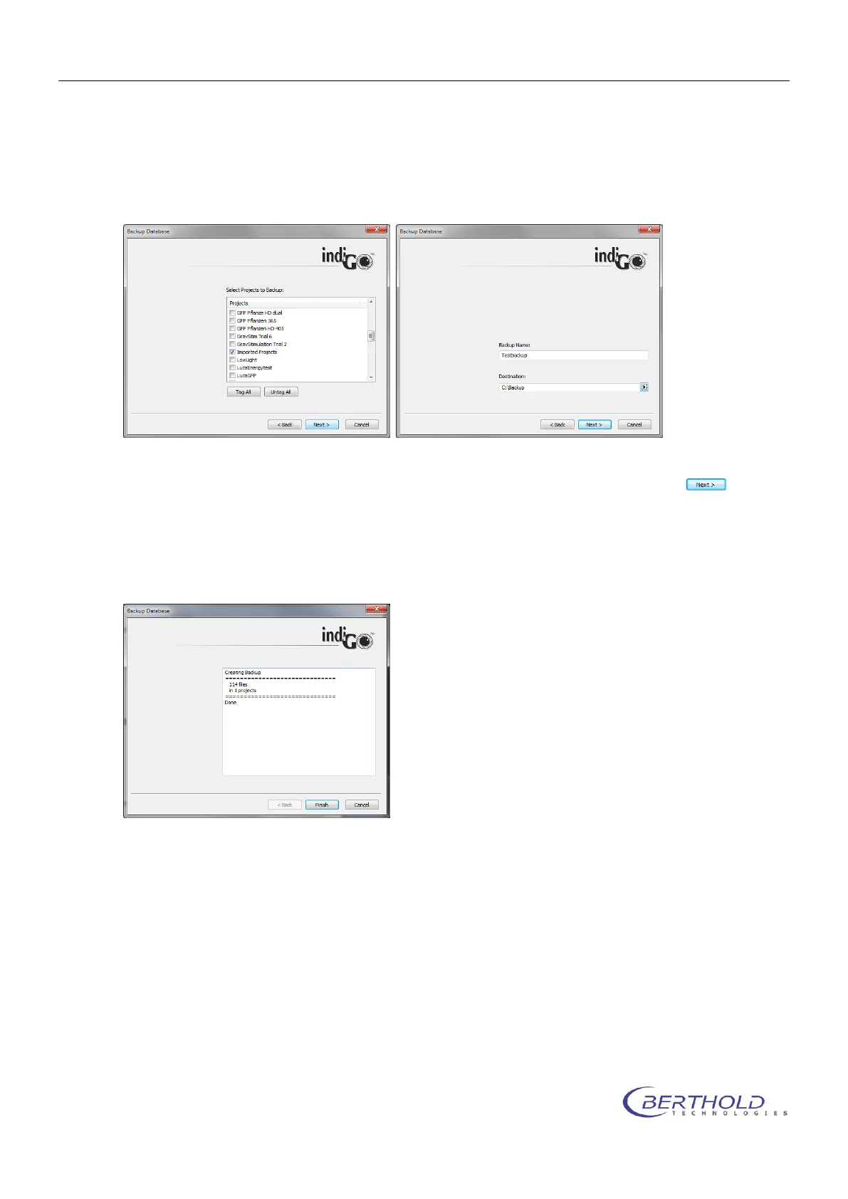 IndiGO can create backups of the database or selected projects. Backups are created using the