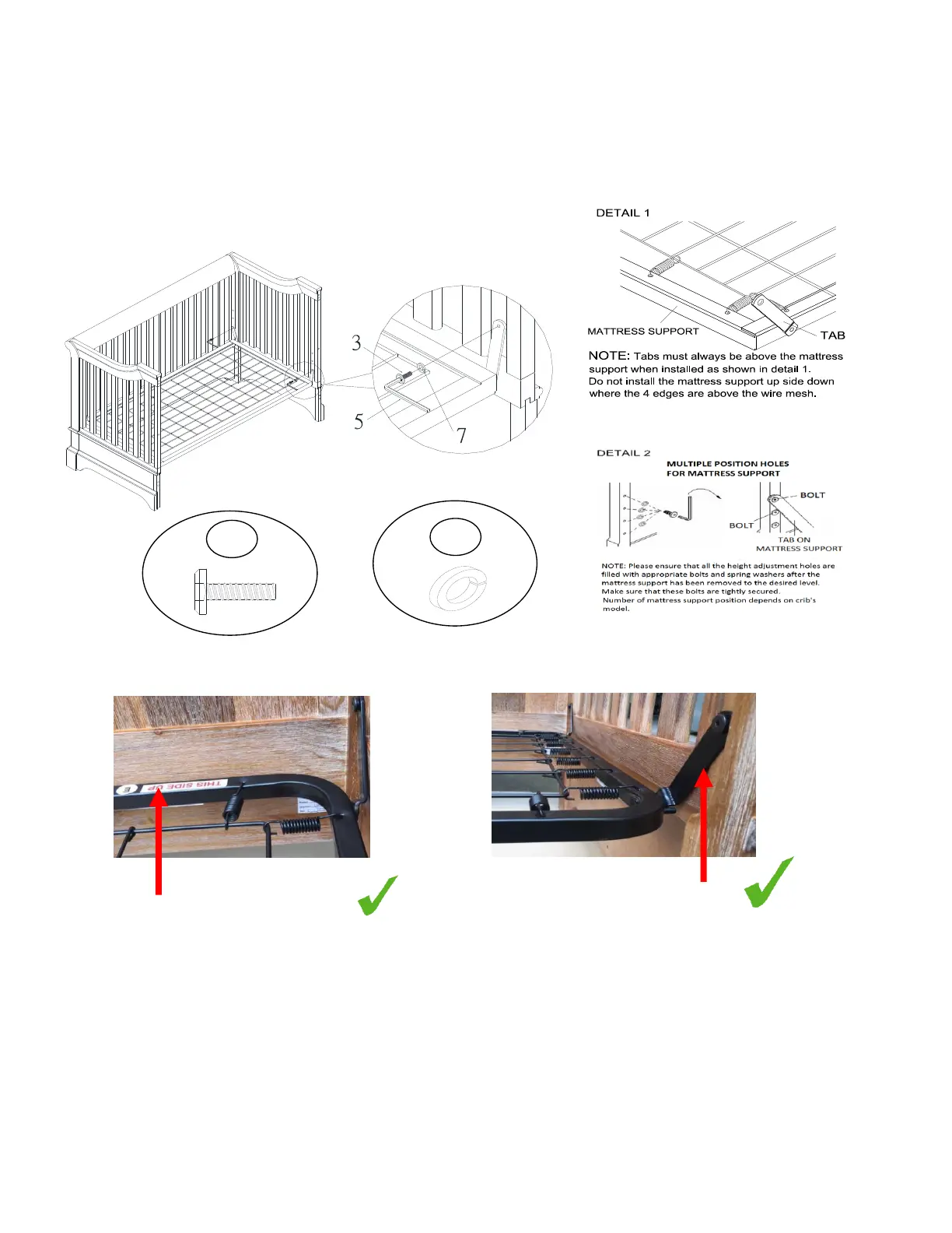 Attach mattress support (H) to the posts with mattress support bolts (3) and spring washers (7).