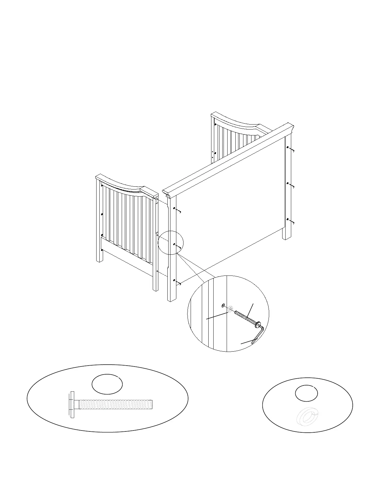 Attach the left side panel (B) and right side panel (C) to the headboard (A) with bolts (1)
