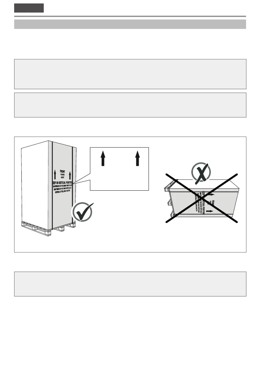 The appliance is moved on the pallet on which it is delivered. It must always be kept in a vertical position as indicated