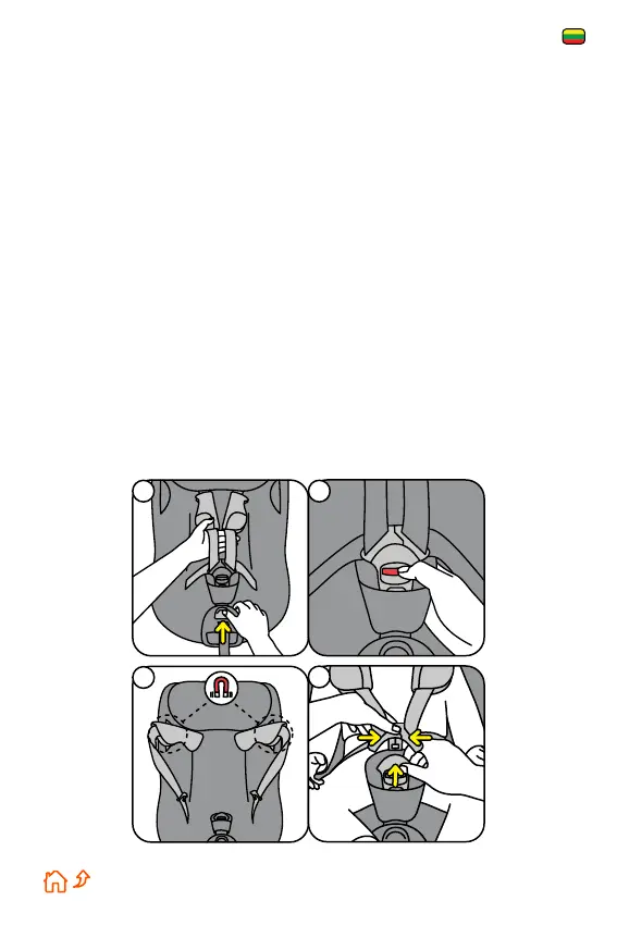 6. Uždėkite perpetės diržus vaikui ant pečių ir užsisekite sagtį. TURITE