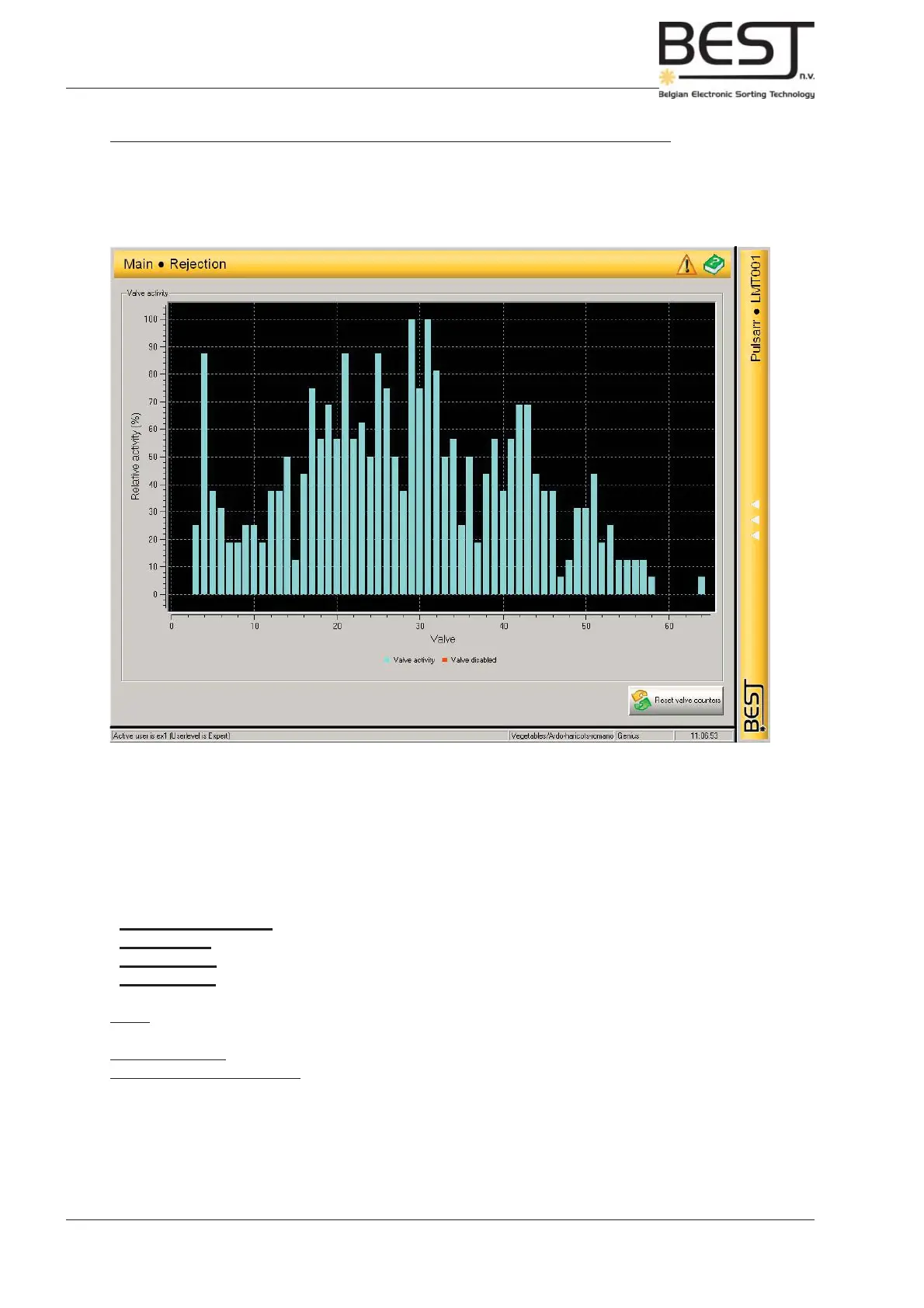 The Rejection menu displays a graph that shows the relative activity of all the valves. In optimum sorting