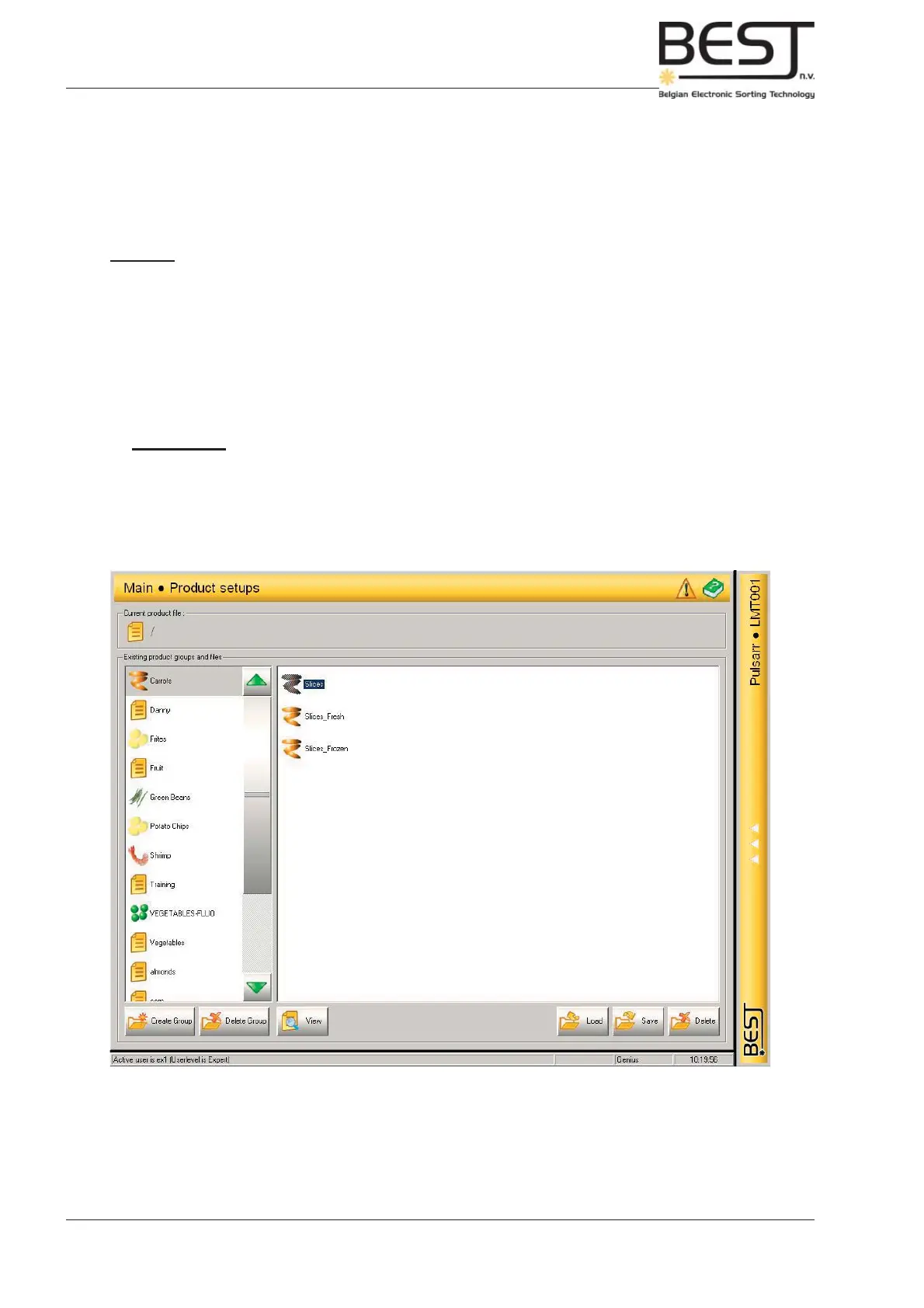 - Delete button (Expert level): press this button to delete the selected product fi le.