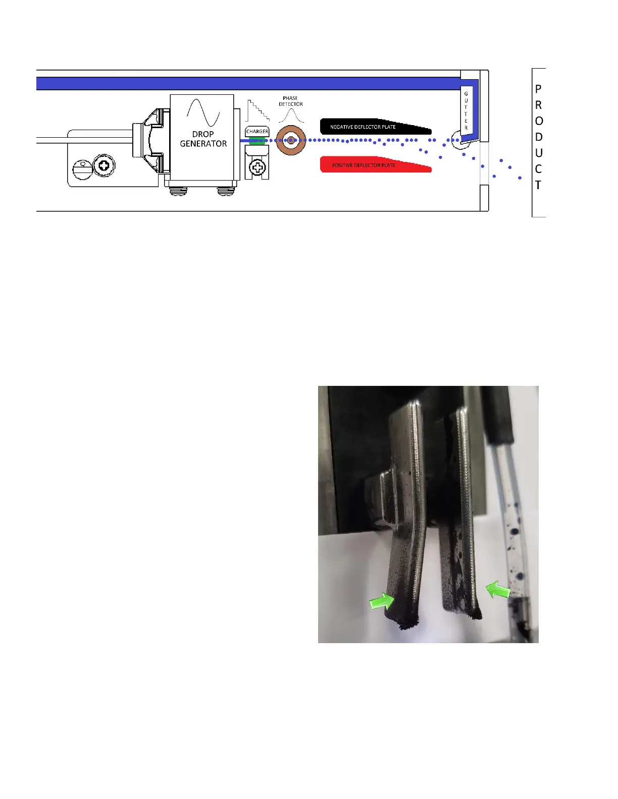 • A charged ink print drop is attracted to the positive deflection plate to be pulled away from continuous ink stream.