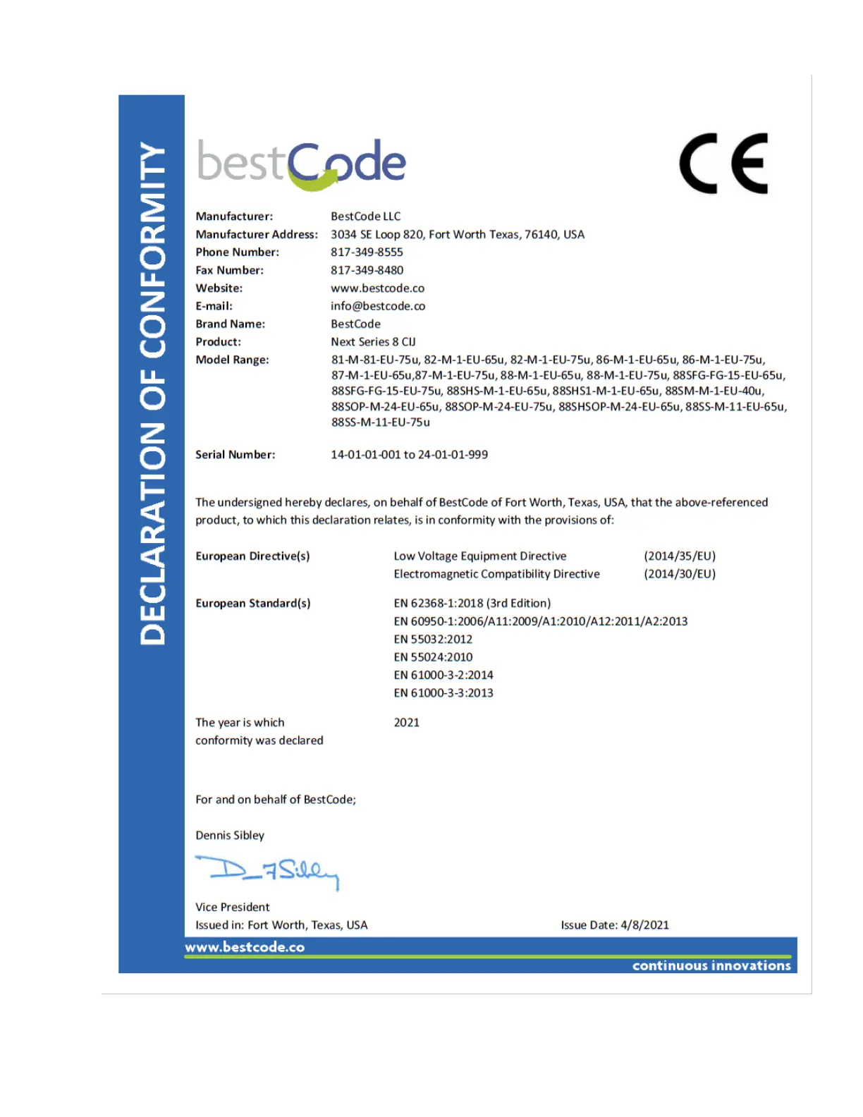 BestCode Next 8 Series - Appendixa - Compliance Certificates
