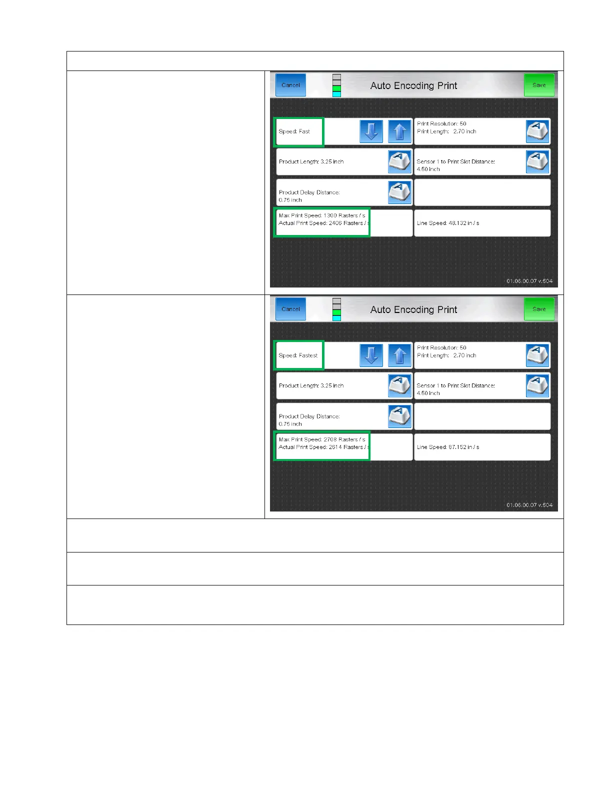 If the speed greatly exceeds the UltraFast Max Print speed, the Font must be changed to a small height font for faster