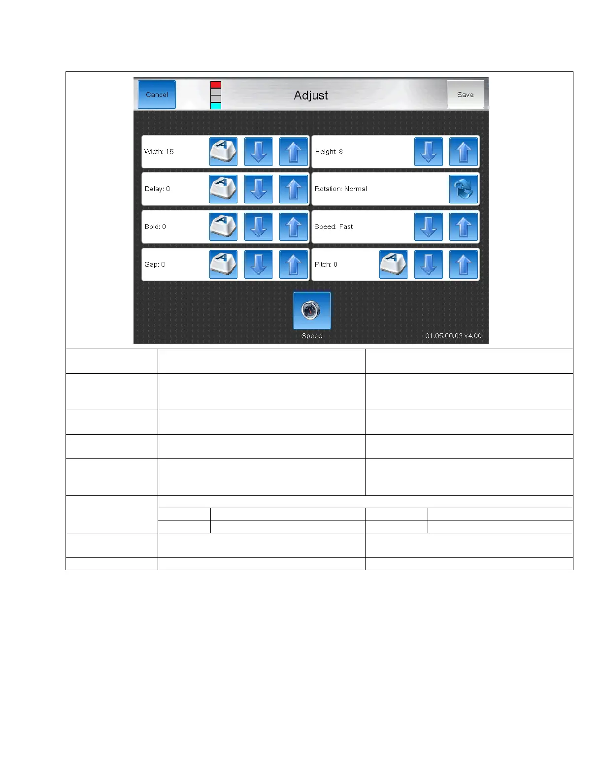 The Adjust screen allows the operator to adjust message settings.
