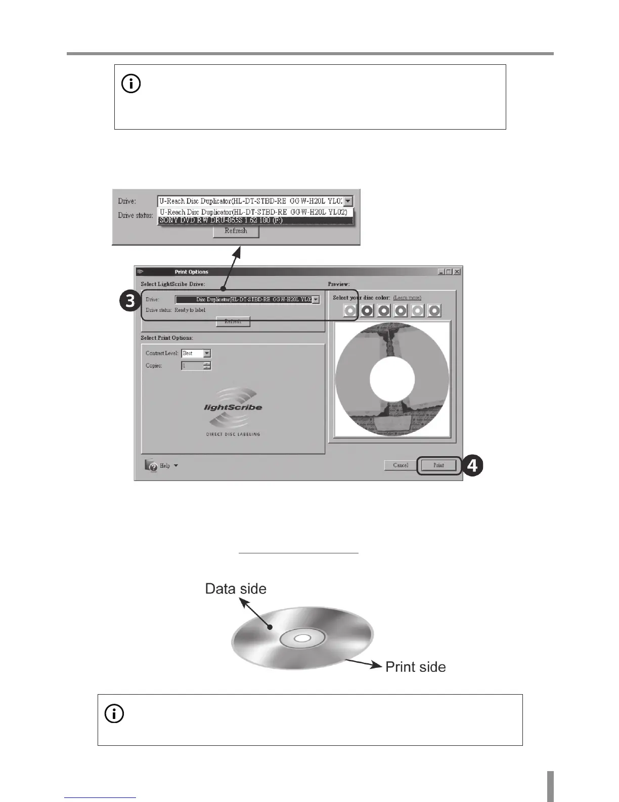 When doing the LightScribe printing, please turn over the disc. The print side is