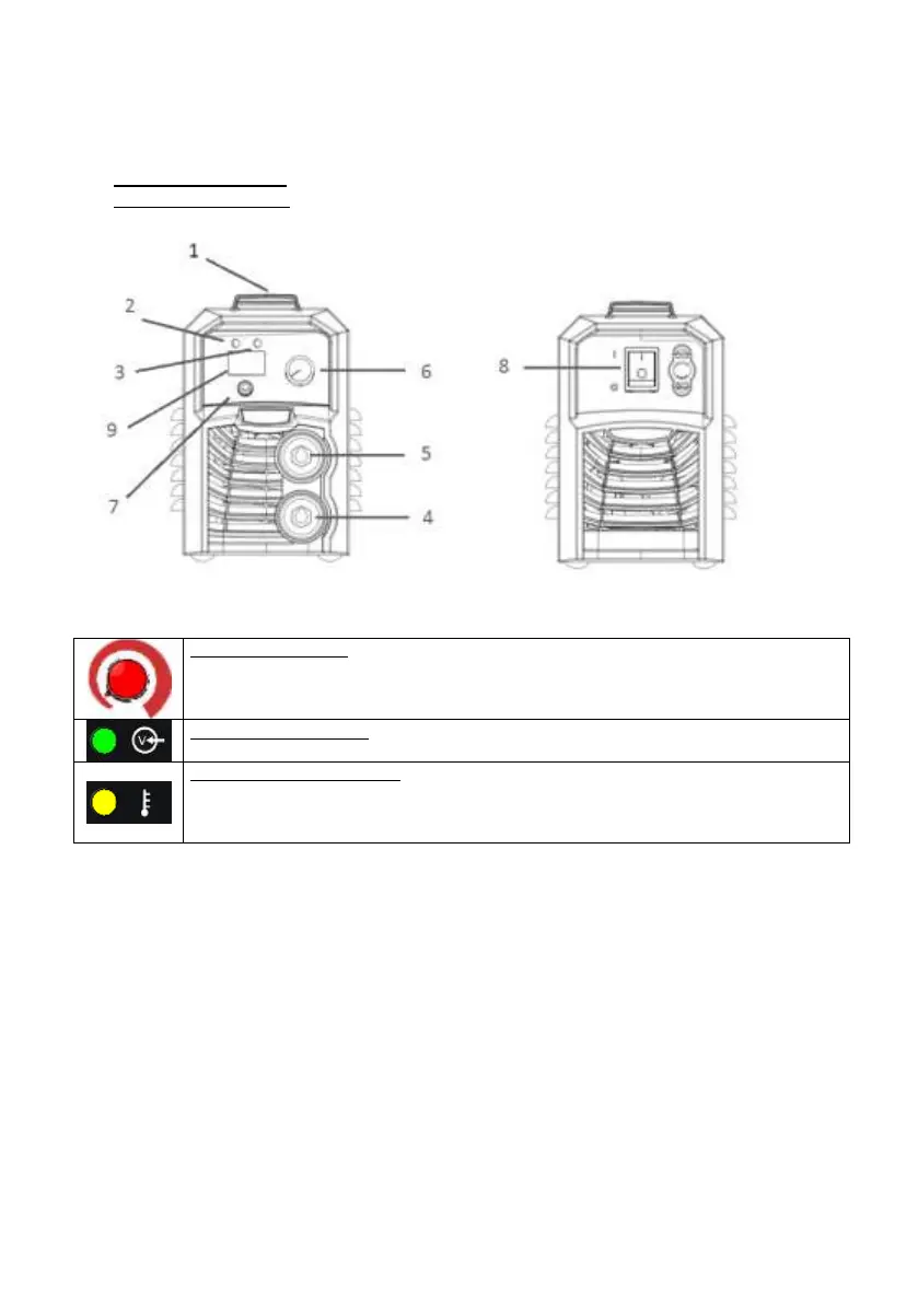 5 – Minusutgång, 6 – Svetsströmreglage, 7 – TIG-pinnväxlare, 8 – Strömbrytare
