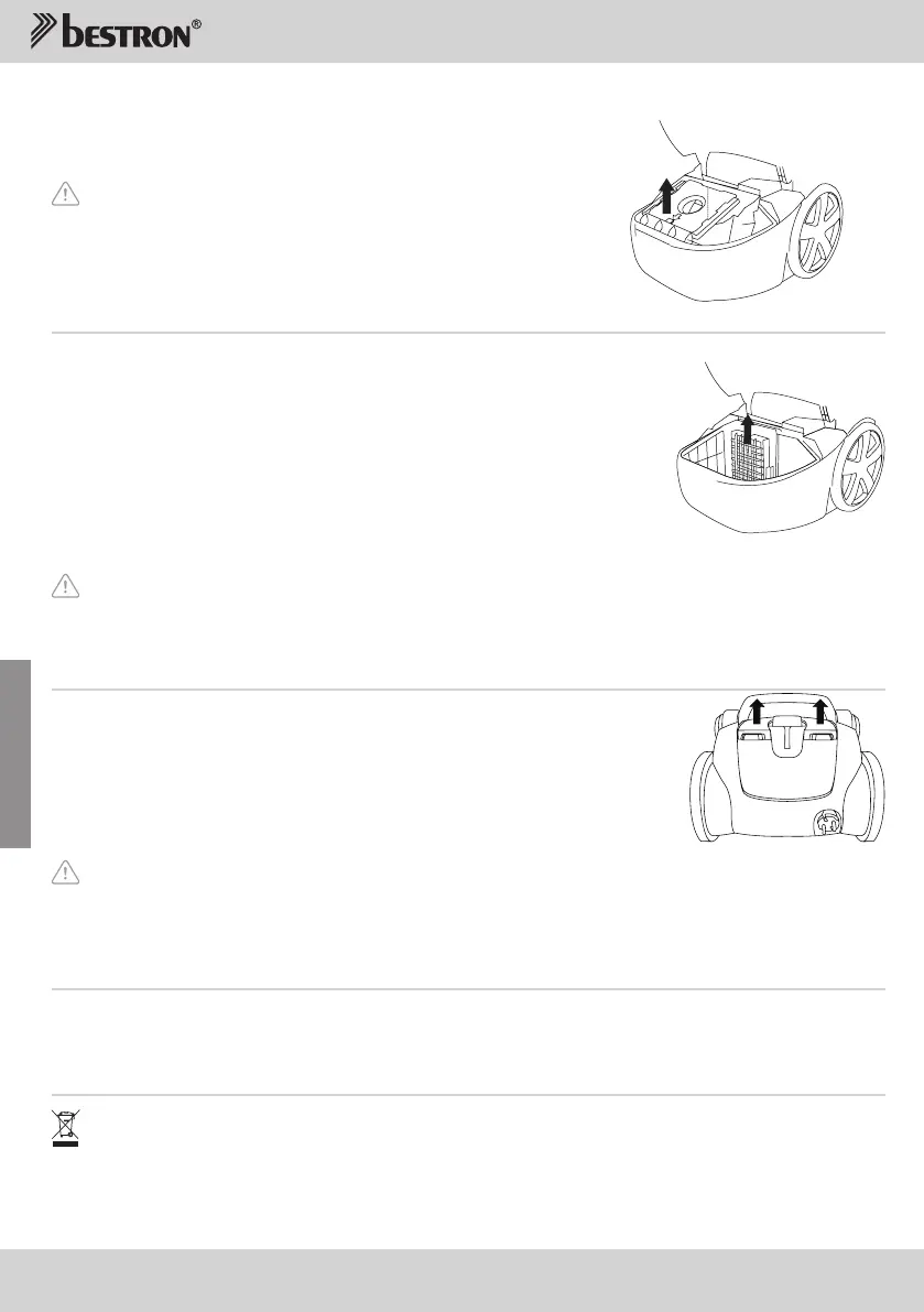 • Make sure that the dust bag does not become pinched by the cover. This could damage the
