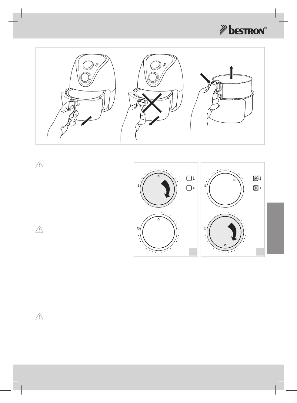 • Do not touch the tray and frying basket, they can become very hot. Take precautions against burns.