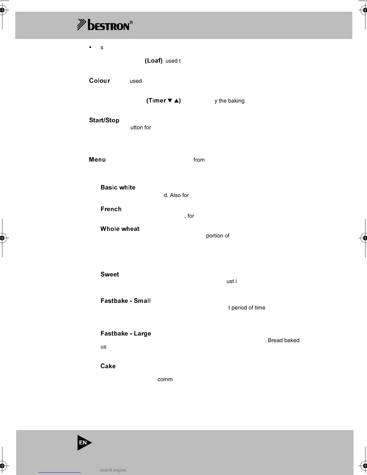button: used to select the required colour of the crust (light, medium, dark) and