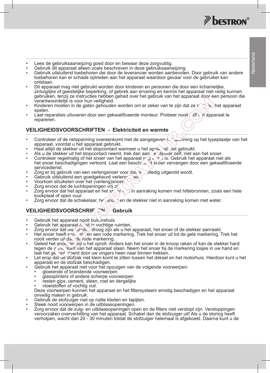 • Gebruik de stofzuiger niet op natte kleden en tapijten.