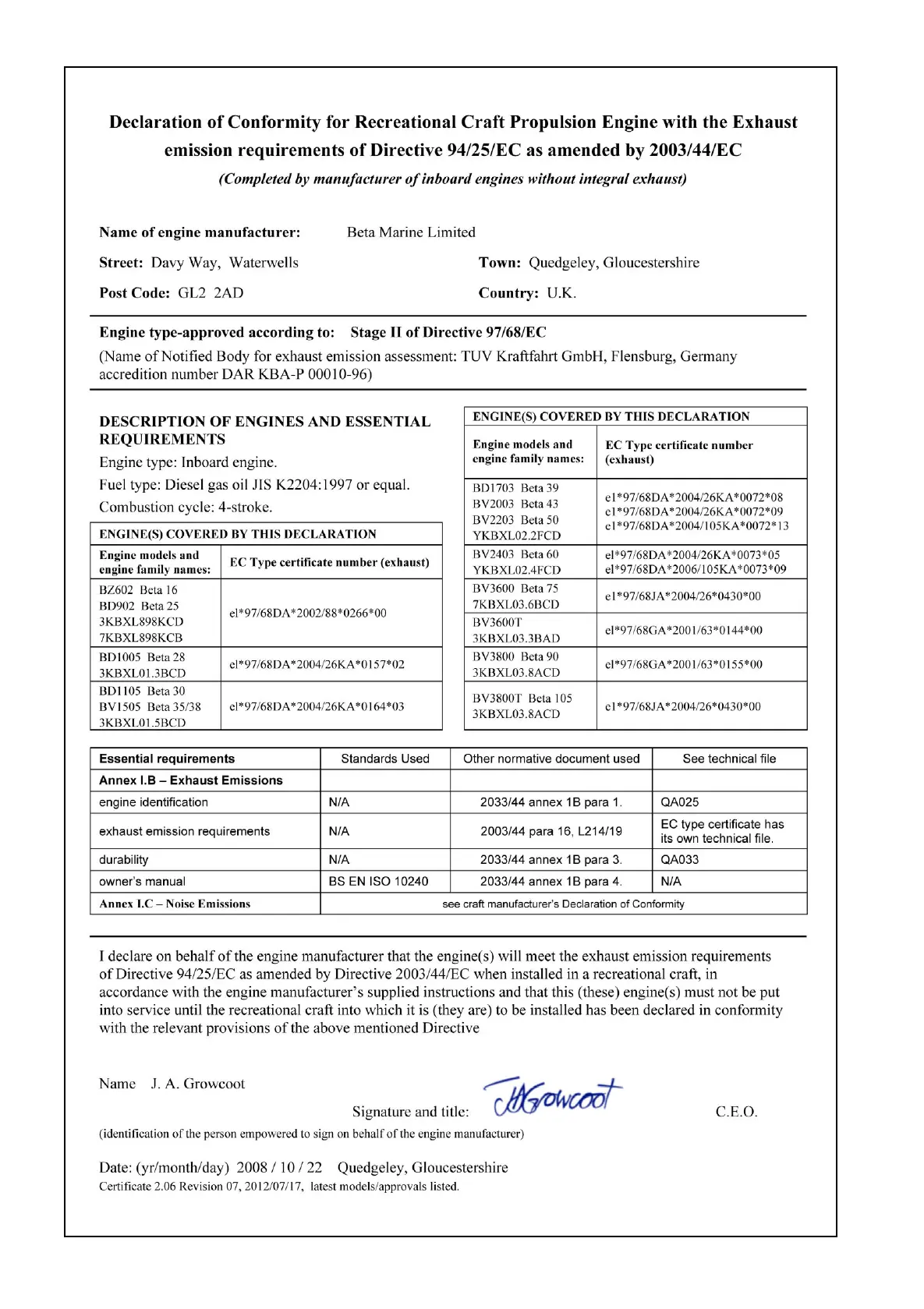Beta Marine Beta 28 - Exhaust Emission - Declaration of Conformity