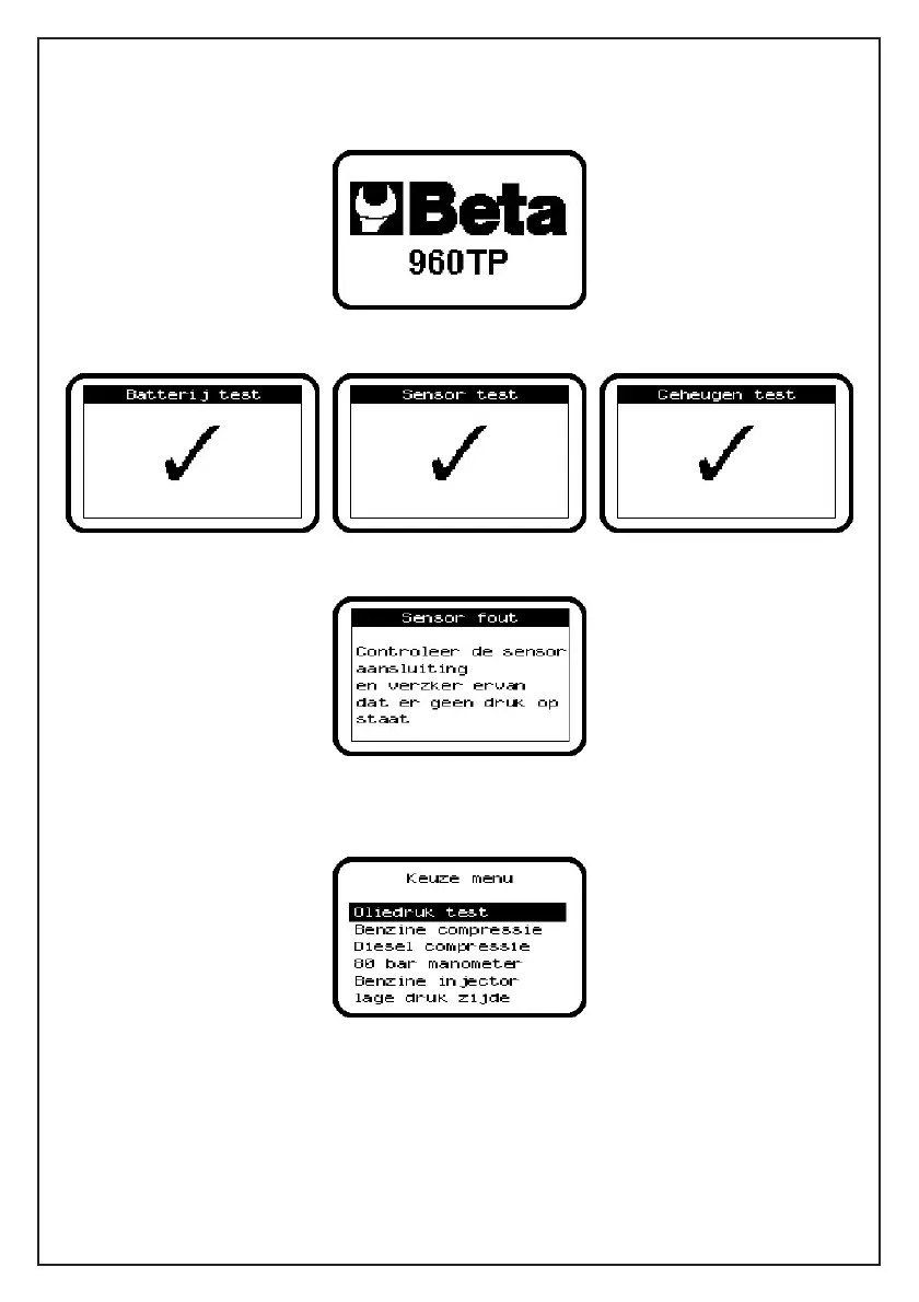 Als de “starttest” succesvol is afgelegd, wordt een menu weergegeven. Het is mogelijk een optie te
