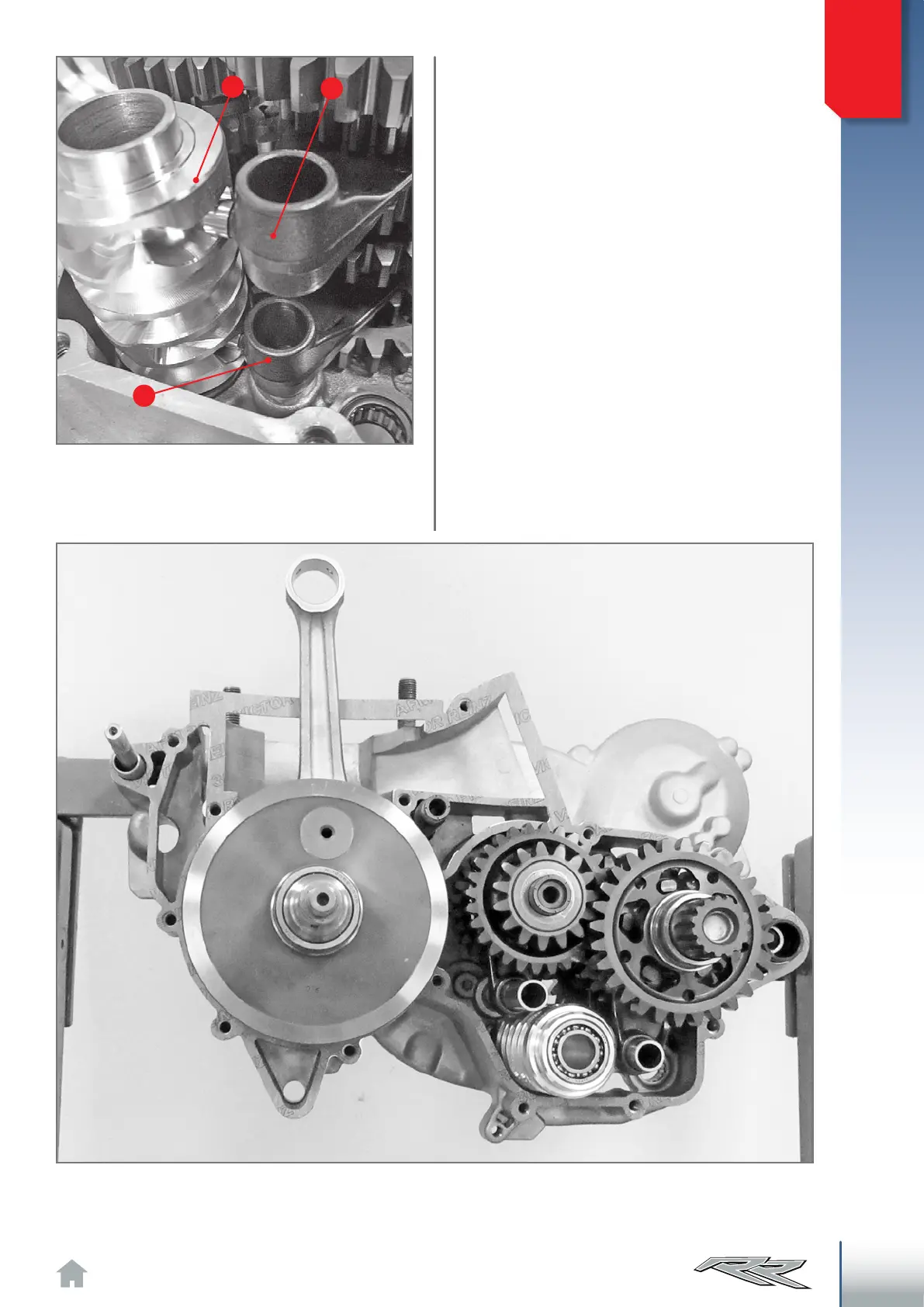 View inside the right crankcase with crankshaft, gearbox shafts complete with wheels, internal gearshift and gasket.