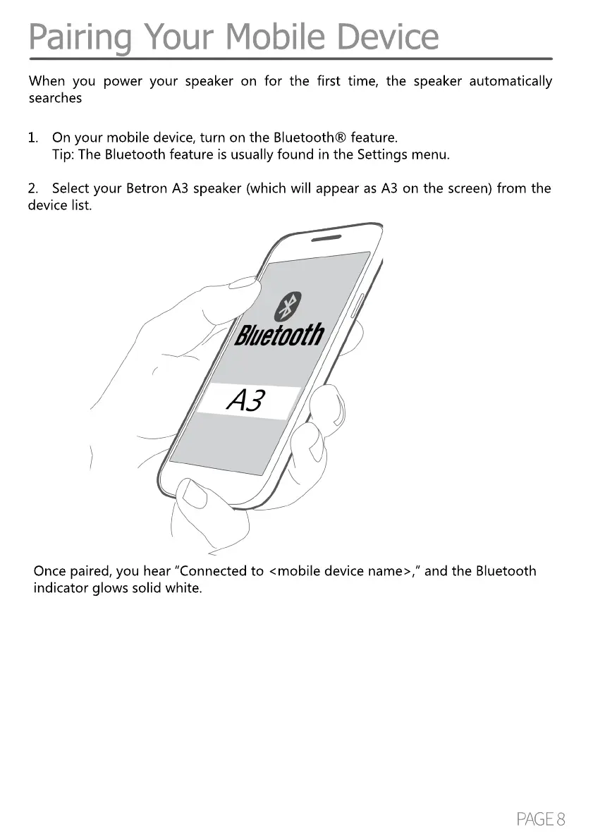Once paired, you hear “Connected to <mobile device name>,” and the Bluetooth