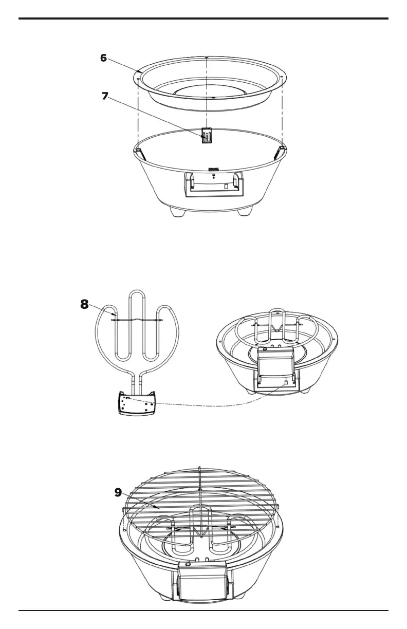5) Position the grill rack. Three downward pointing spokes should be aligned with and placed