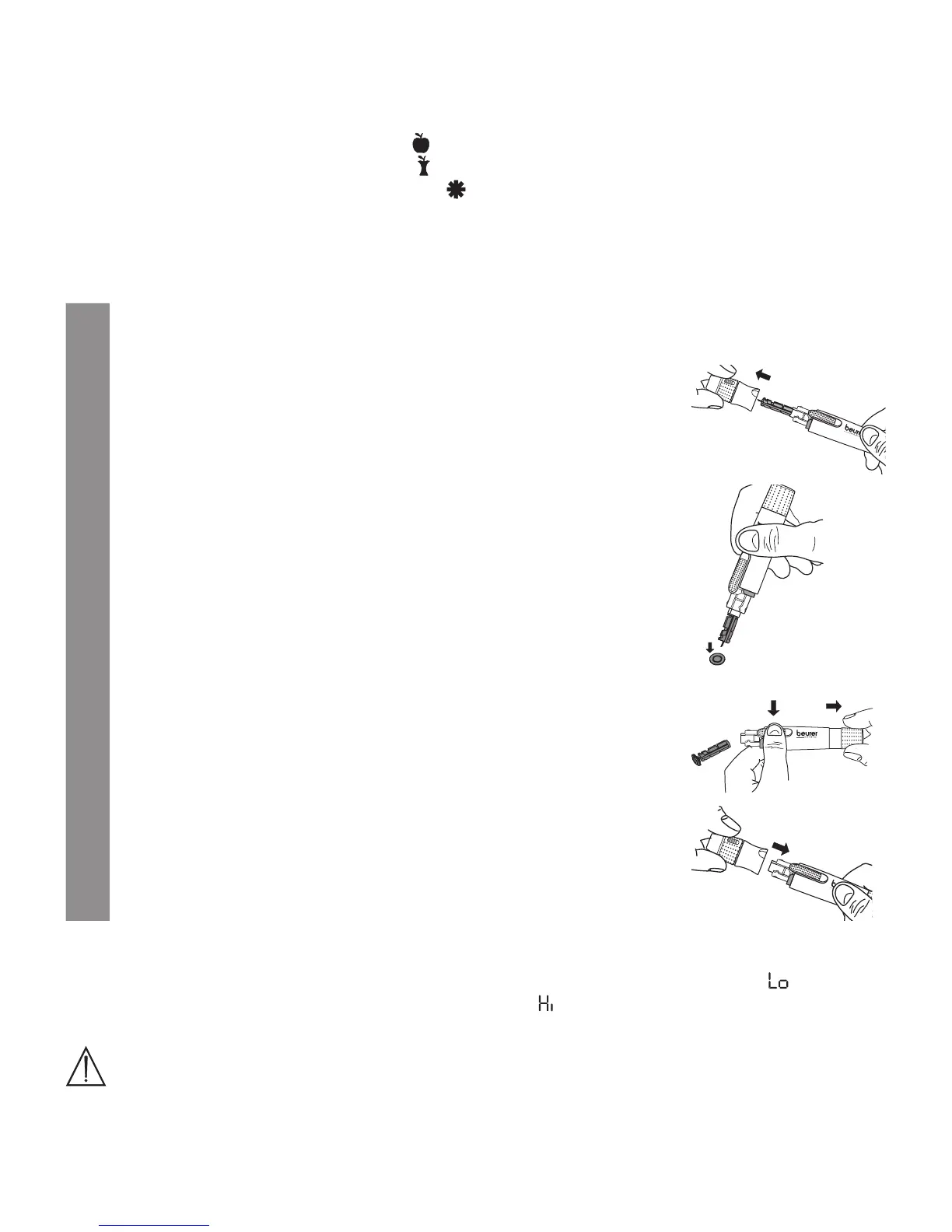 Your blood glucose monitor can process values between 1.1 and 35.0 mmol/L. The “ ” warning is